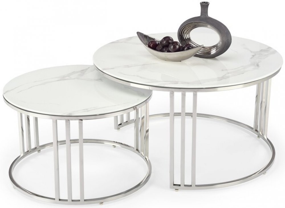 Sada dvou konferenčních stolků MERCURY 2 je ideální nabídkou pro všechny milovníky elegantního designu. Nábytek - kromě toho, že vypadá jako moderní dekorace - umožňuje také flexibilně spravovat prostor. Tato sestava se skládá ze dvou stolů, které mohou stát zvlášť, ale pokud potřebujete ušetřit místo, dají se jednoduše složit do sebe. Desky obou stolů jsou vyrobeny ze skla imitujícího mramor, kte...