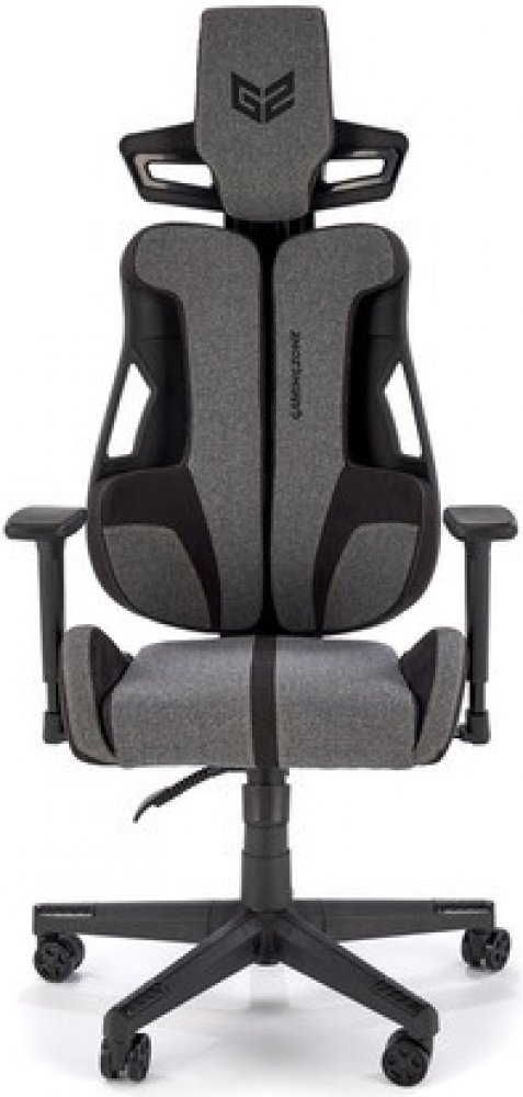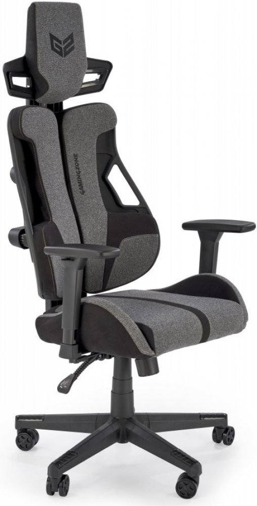 Designéři pro židli zvolili kvalitní potahový materiál v podobě hladké tkaniny s odolným povrchem a pěkně vyvedenými švy. Elegantní šedý povrch doplňují černé akcenty, které celý design židle sjednocují a dodávají mu výrazný efekt. Potahový materiál pokrývá měkký ohraničený sedák i nevšedně tvarovanou zádovou opěrku půlenou tak, aby dokonale přilnula k zádům a poskytovala maximální komfort. Stejně jako podhlavník, doplněný o dvojici držáků pro snadnější manipulaci s židlí. Praktičnosti dodávají i stylové područky s výškovým nastavením.