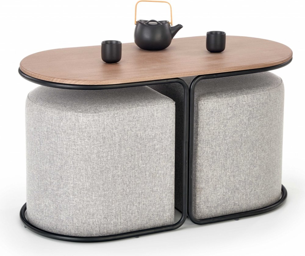 Konferenční stolek Pampa Konferenční stolek Pampa poskytuje perfektní řešení pro prostorově omezené či dynamické obývací pokoje, čajovny i recepce. Stabilní konstrukce z práškované oceli nese prostornou desku z dřevovláknité desky. Ta je potažená dýhou v dekoru ořechu, jenž dodá místnosti přírodní prvek a tím i útulnost. Stolek tvoří sadu se 2 taburety, které v případě potřeby jednoduše umístíte pod desku stolu. Nemusíte si tak lámat hlavu, jak zvolit ladící prostředky k sezení. Předností je také jeho nenáročná údržba. Zvládnete ji pár tahy vlhkým hadříkem. Taburety umístíte pod deskou stolu