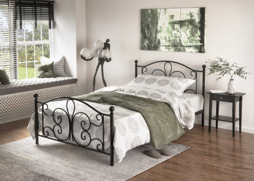 Kovová postel 90x200 - forma a charakter Jednomístná postel Panama nabízí komfortní místo ke spánku v kompaktním formátu. Ažurové, ohýbané vzory na čele a u nohou a kulovité zakončení sloupků zdůrazňují dekorativní charakter nábytku a umožňují pohodlně opřít polštáře. Stabilní konstrukce a rošt v sadě Konstrukce z práškově lakované oceli zajišťuje pevný základ, díky čemuž postel slouží jako stabilní opora pro matraci. V sadě je rošt, takže je hned připravený základ ke spánku - stačí vybrat matraci o rozměrech 90x200 cm. Rozměry a ergonomie používání Vnější rozměry 94/93/209 cm pomáhají optimálně využít místo v pokoji pro mládež, hostinském pokoji nebo v garsonce. Podpora na nožkách usnadňuje udržování čistoty pod nábytkem, což podporuje každodenní péči o prostor. Montáž a praktické informace Model je určen k samostatné montáži; v balení jsou všechny díly i návod, což umožňuje rychle připravit postel k používání. Hmotnost cca 20 kg usnadňuje umístění nábytku při aranžování interiéru. Matrace se vybírá samostatně. Provedení konstrukce: ocel s práškovým nástřikem Barva černý