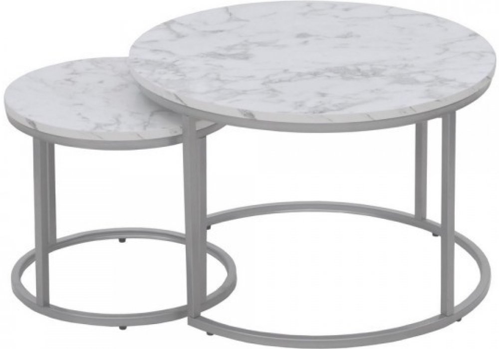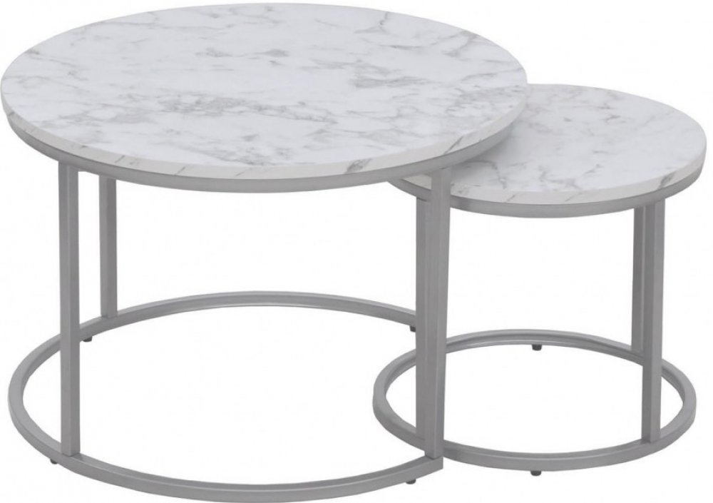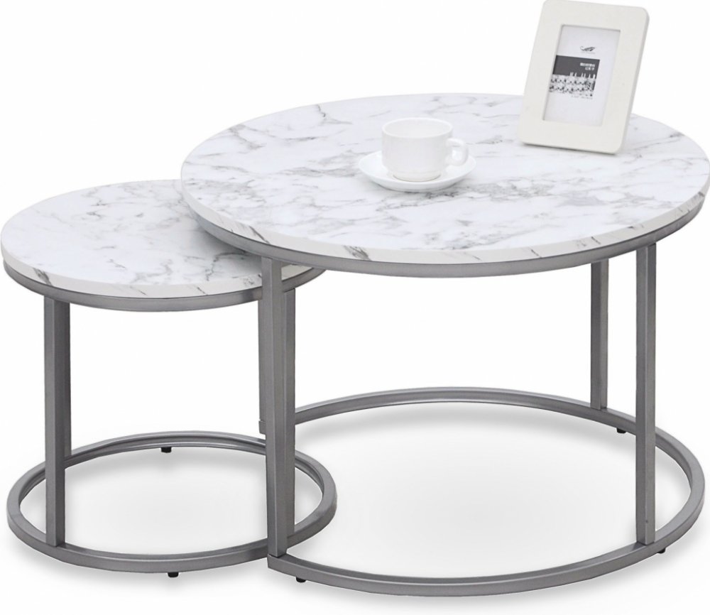 Vrchní plocha je vyrobená z kvalitní nábytkové desky. Ta je vyvedená v okouzlujícím dekoru bílého mramoru s šedým žíháním a díky tomu přinese do místnosti hezký zesvětlující prvek. Podstavec tvoří kulatý kovový rám se stříbrným nástřikem, který tak ještě podtrhuje elegantní design těchto dvou krásných stolků.