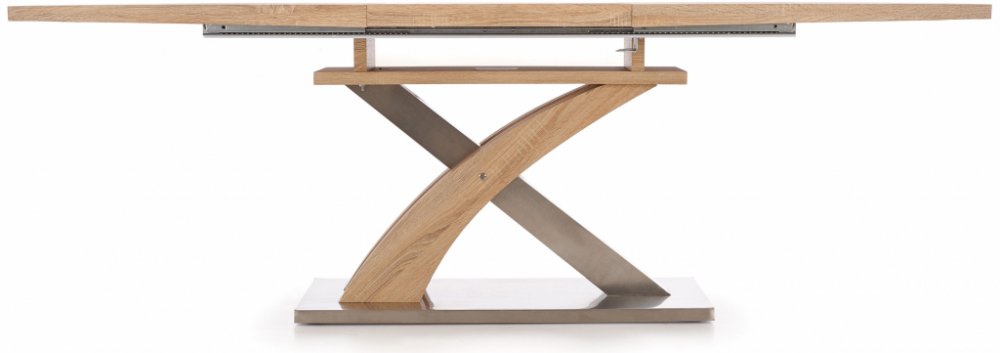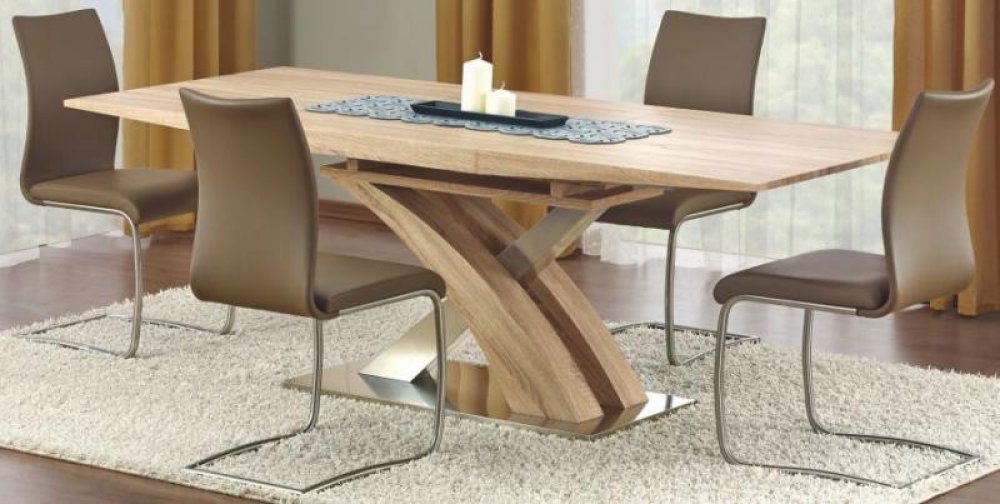 Rozkládací jídelní stůl je vyroben v kombinaci dřevěné MDF desky a centrální podnože, která je upevněna na stabilní základnu z lesklé nerezové oceli.