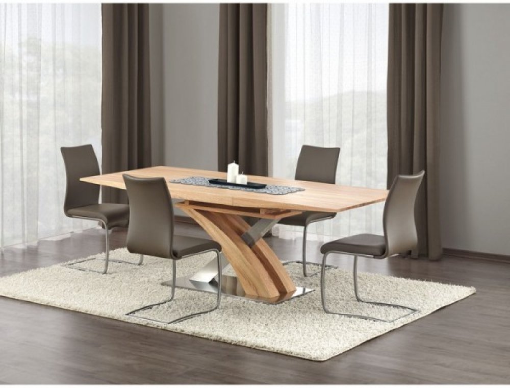 Jídelní stůl Sandor působí velmi elegantně a vzhledem ke svému provedení je skvělou volbou do nejrůznějších designových prostorů, moderních domácností, hotelů či restaurací.Stůl je specifický zejména svou konstrukcí podstavy, která se skládá ze tří překřížených nohou. Ty jsou pro větší stabilitu zapuštěny do obdélníkové podstavy vyrobené v kombinaci nerezové oceli a lakované MDF desky. Podstava je navíc vybavena speciálními nožičkami proti poškrábání, které zajišťují také pohodlný kontakt s podlahou. Horní deska je z lakovaného dřeva.Velkou výhodou jídelního stolu je jeho praktické zpracování, protože si jej můžete rozložit a vytvořit tak další plochu pro umístění věcí či hostů. Základní rozměry stolu jsou 160 x 90 cm, po rozložení pak 220 x 90 cm.Jídelní stůl Sandor dodáváme ve dvou barevných provedeních.Stůl dodáváme v demontovaném stavu. Součástí je samostatný stůl, bez židlí.Hlavní přednosti jídelního stolu Sandor Jídelní stůl oslní svým stylovým provedením Snadno rozložitelný pro rozšíření plochy Konstrukce vyrobena v kombinaci oceli a MDF desek Podstava doplněna nožičkami pro pohodlný kontakt s podlahou Stůl dodáváme ve dvou barevných provedeních