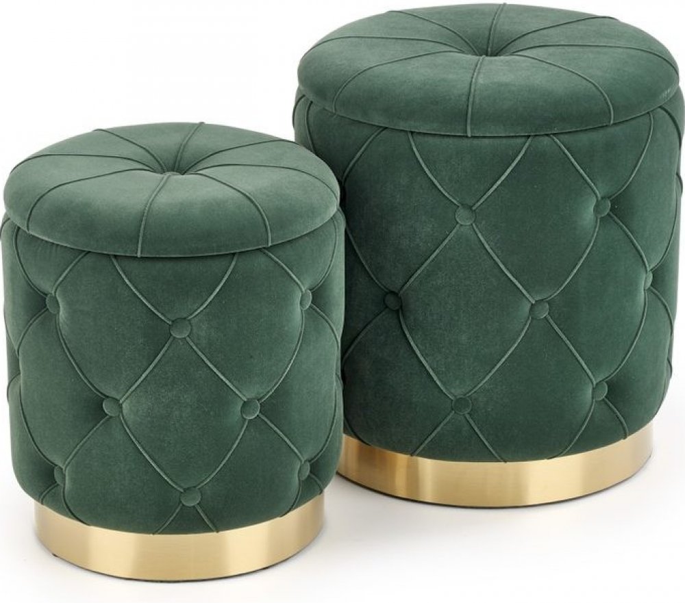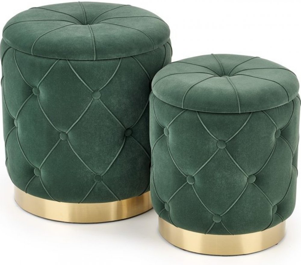 Taburetky POLLY jsou dostupné v sadě skládající se ze dvou produktů - liší se rozměry. Nábytek v glamour stylu se skvěle hodí do moderních prostor - je to ideální varianta pro všechny, kteří chtějí vytvořit luxusní interiér napomáhající relaxaci. Kulatá základna je vyrobena z chromované oceli ve zlaté barvě, která jemně kontrastuje s texturou a barvami látky pokrývající taburet. Sedák i boky taburetů POLLY v zeleném odstínu jsou ozdobně prošívané, díky čemuž se tvar stává jakousi ozdobou aranžovaného prostoru. Model POLLY kromě estetické funkce splní i praktickou roli - zvednutím horní části se zpřístupní úložný prostor, do kterého lze uložit drobné příslušenství.
