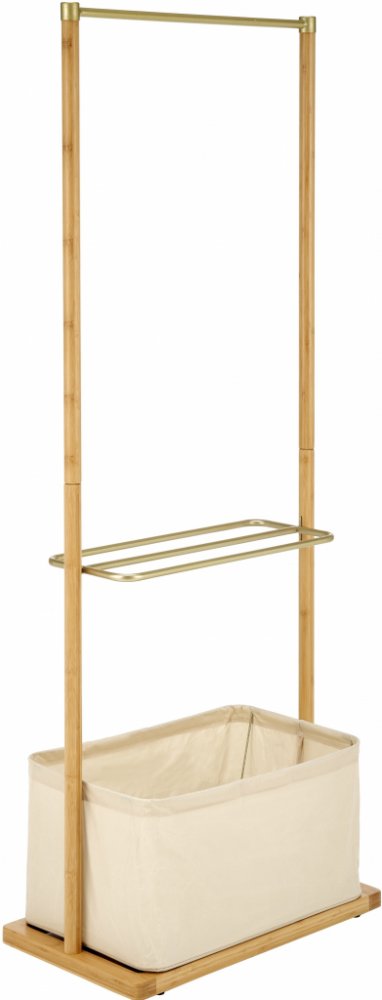Stojan na šaty Carlton Hledáte způsob, jak do předsíně či ložnice přidat místo k odložení oděvů a zároveň dodat místnosti útulný vzhled? Pak je šatní stojan Carlton tou správnou volbou. Svou funkci splní na výbornou také ve wellness centrech, masážních salónech či v hotelových pokojích. Bambusovou konstrukci ozvláštňují prvky z práškované oceli ve zlaté barvě. Kromě věšákové tyče je ocelová také police, která poslouží k odložení domácí obuvi. Ve spodní části najdete praktický látkový košík pro šátky, klobouky, deštníky nebo například ručníky. Přestože stojan poskytuje spoustu odkládacího místa, díky subtilní konstrukci se hodí i do menších interiérů a v místnosti bude nenápadným pomocníkem. Stojan na šaty Carlton