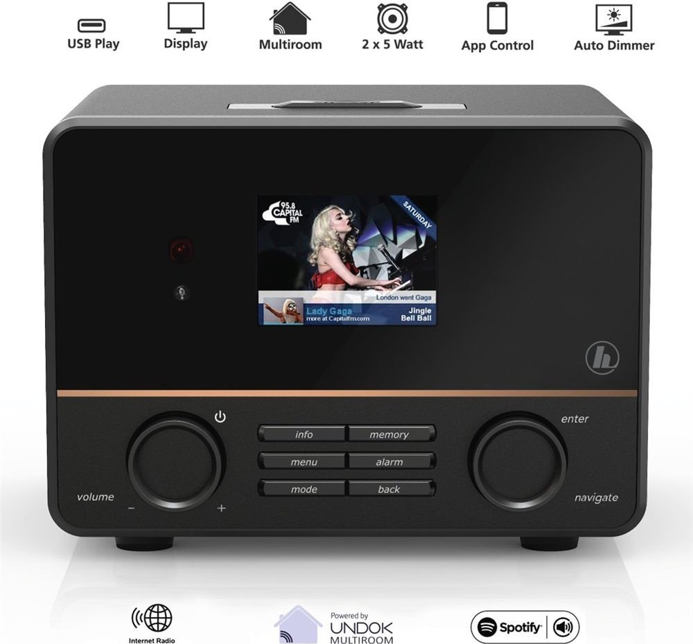 Internetové rádio, Multiroom, kompatibilní se Spotify Connect, výkon 10 W, USB připojení/nabíjení, barevný TFT displej, senzor osvětlení, vstup AUX, LAN, výstup pro sluchátka, budík, časovač vypnutí, dálkové ovládání