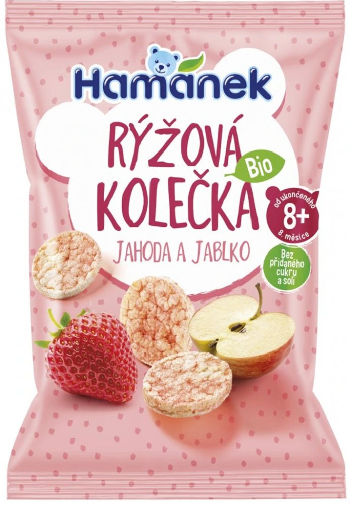 Bio rýžová kolečka Hamánek s příchutí jahoda a jablko o váze 35 g jsou vyrobená z bio pufované rýže, obsahují bio prášek z jahody a jablka. Kolečka mají příjemnou ovocnou chuť. Díky pohodlnému kulatému malému tvaru se snadno drží v malé dětské ruce - ať už doma, na cestách nebo na procházce. Bez přidaného cukru a soli, neobsahují alergeny, konzervanty ani lepek. Obsahují vitamín B1.