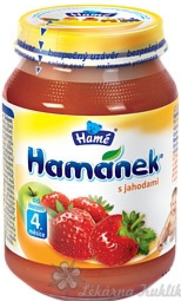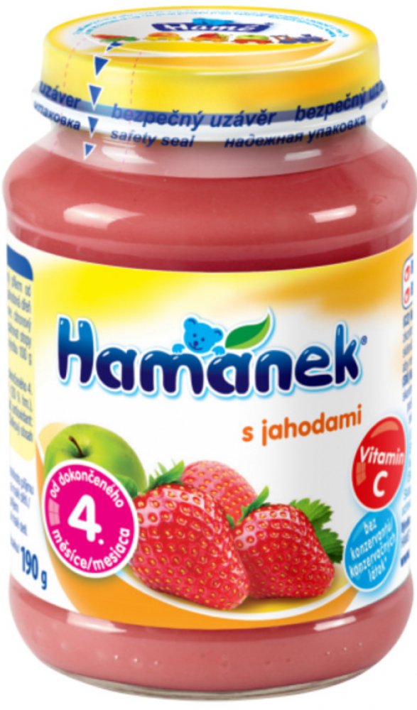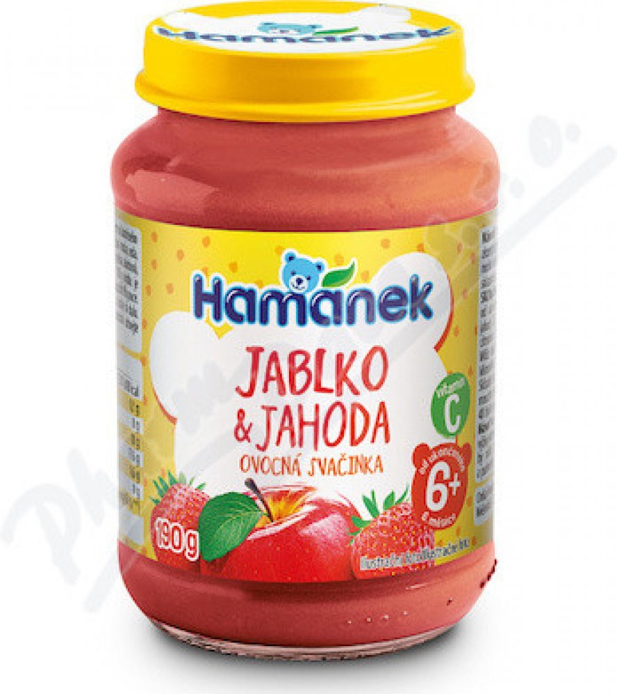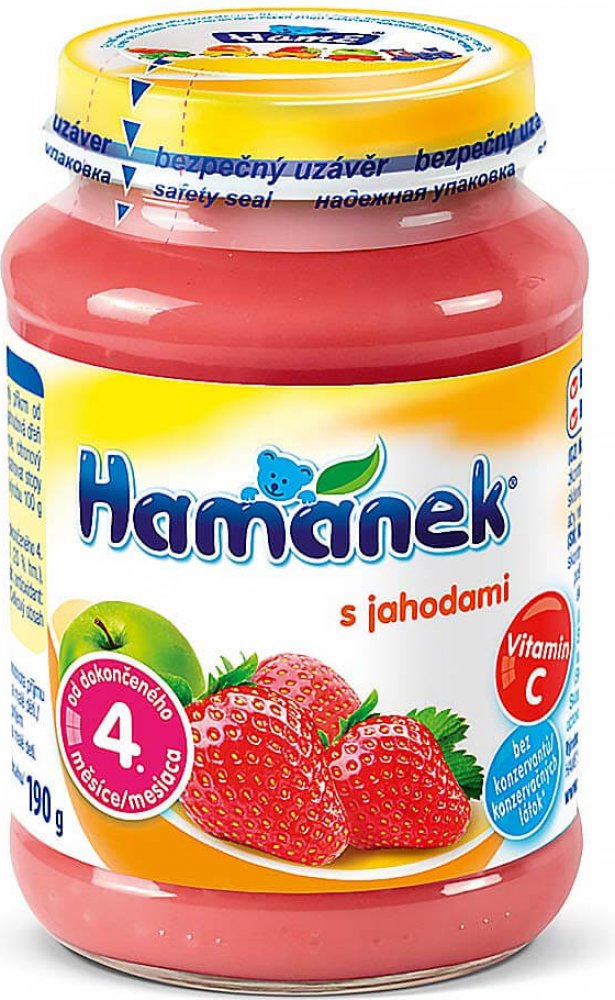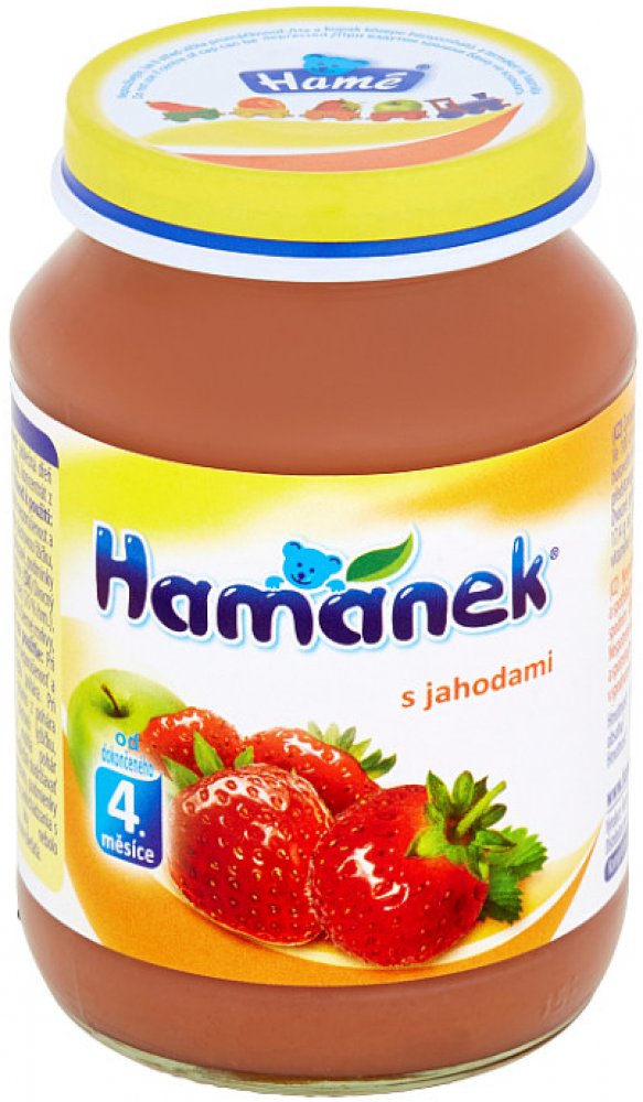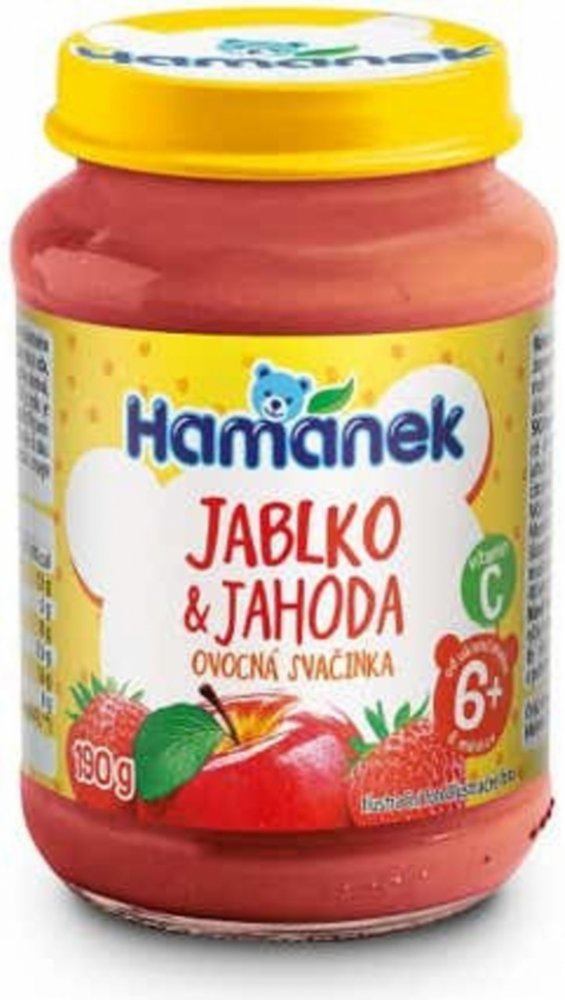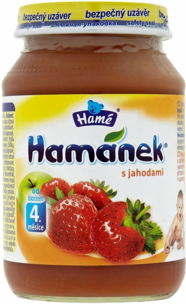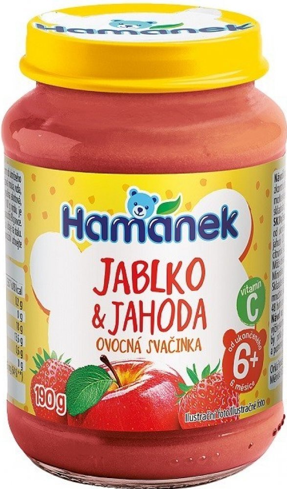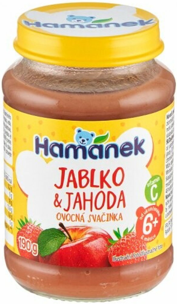 Informace o výrobku Ovocný příkrm Hamánek Jahoda a jablko je ovocná svačinka vhodná už od ukončeného 6. měsíce. Doplní energii a vitamíny nejmenším dětem, ale zaujme i větší děti, na výletě nebo doma. Je to zkrátka svačinka pro každého. Vyzkoušejte i další příchutě pro pestrý a chutný jídelníček vašich dětí. Informace o značce Dlouholeté zkušenosti ve výrobě kojenecké stravy Hamánek vám dávají jistotu, že dětem nabízíte v prvních měsících života to nejkvalitnější. Na vývoji příkrmů značky Hamánek se podílí čeští pediatři a odborníci na výživu dětí. Výsledkem je nutričně vyvážená a pečlivě kontrolovaná strava. S každou lžičkou Hamánka tak Vaše děťátko získává to nejcennější z přírody a Vy si můžete být jistá, že mu dáváte s maximální péčí to nejlepší pro zdravý růst a vývoj. Od dokončeného 4. měsíce Obsahuje vitamin C Bezpečnostní víčko Nejvyšší kvalita surovin určená pro kojeneckou výživu Bez konzevačních látek, aromat a barviv* Neobsahuje lepek *dle zákona Příprava a použití Návod k použití: Při otevření musí víčko klapnout. Před podáváním příkrmu zkontrolujte neporušenost a celistvost hrdla sklenice. Při konzumaci přímo ze skleničky používejte plastovou lžičku, kovová by mohla skleničku poškodit. Je důležité dodržovat návod k přípravě, podmínky skladování a zacházení s výrobkem, aby nedošlo k ohrožení zdraví dítěte. Nepoužívejte, lze-li střed víčka promáčknout. Věková hranice od 5 měsíců Skladování Nepotřebované množství uchovejte v chladničce v uzavčené skleničce a spotřebujte do 48 hodin po otevření. Skladujte v suchu a temnu při teplotě 0-30°C.
