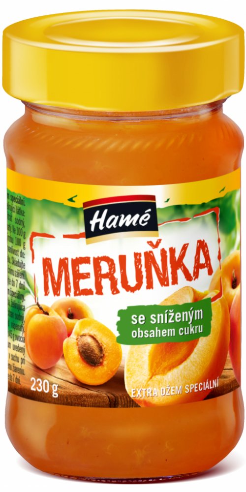 Složení: meruňky 45 %, cukr, voda, želírující látka: pektin, rregulátory kyselosti: kyselina citronová, citrát sodný antioxidant: kyselina askorbová, stabilizátor: chlorid vápenatý.