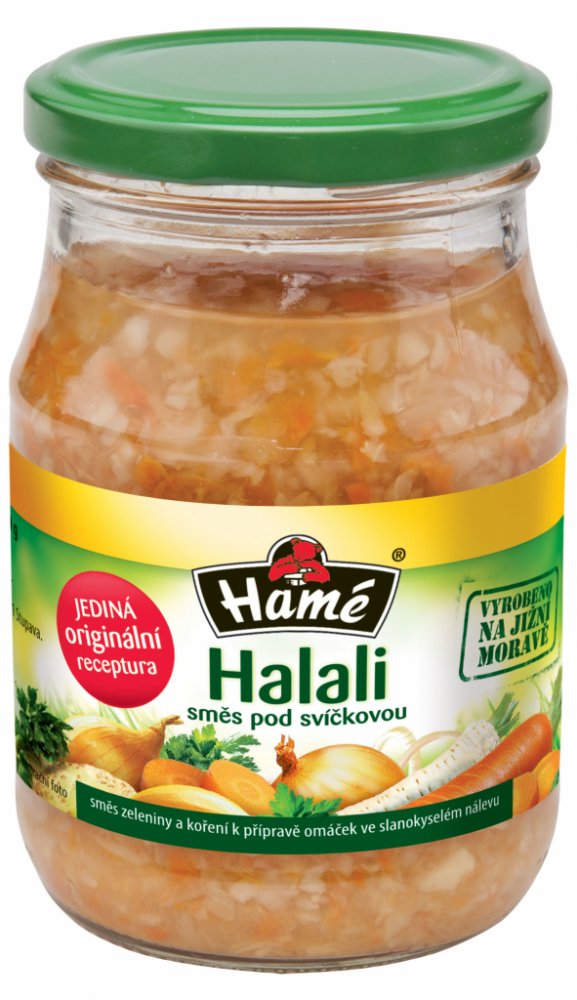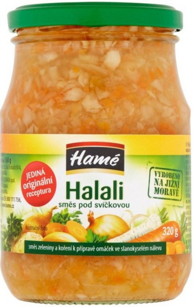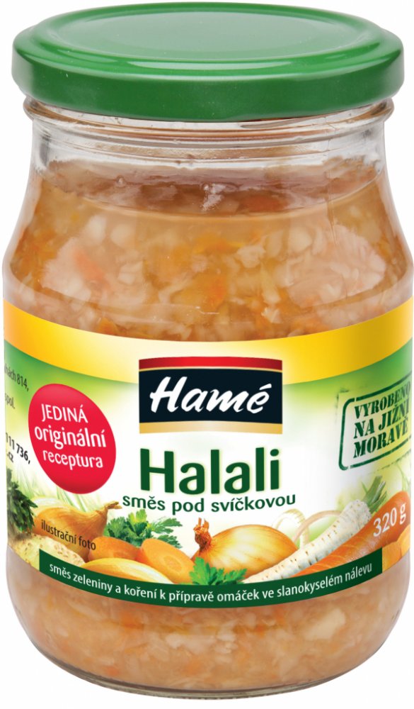 Co tomu říká sám dodavatel?Jedinečná zeleninová směs Halali je skvělá pro rychlou přípravu výborné domácí svíčkové omáčky.Společnost Hamé je přední českou potravinářskou firmou, zabývající se výrobou trvanlivých i chlazených potravin, jejíž tradice sahá k 20. létům minulého století. Do pozornosti zákazníků se dostala zejména díky výrobě paštik a masových výrobků.Co byste měli vědět?Celkový obsah soli max. 5,5%. Pevný podíl minimálně: 160 g.Vyrobeno na Jižní Moravě.Alergici pozor!Obsahuje celer.Jak skladovat a používat?Skladujte v suchu a temnu při teplotě 0 - 28 °C.Po otevření uchovejte v chladničce do 10 °C.
