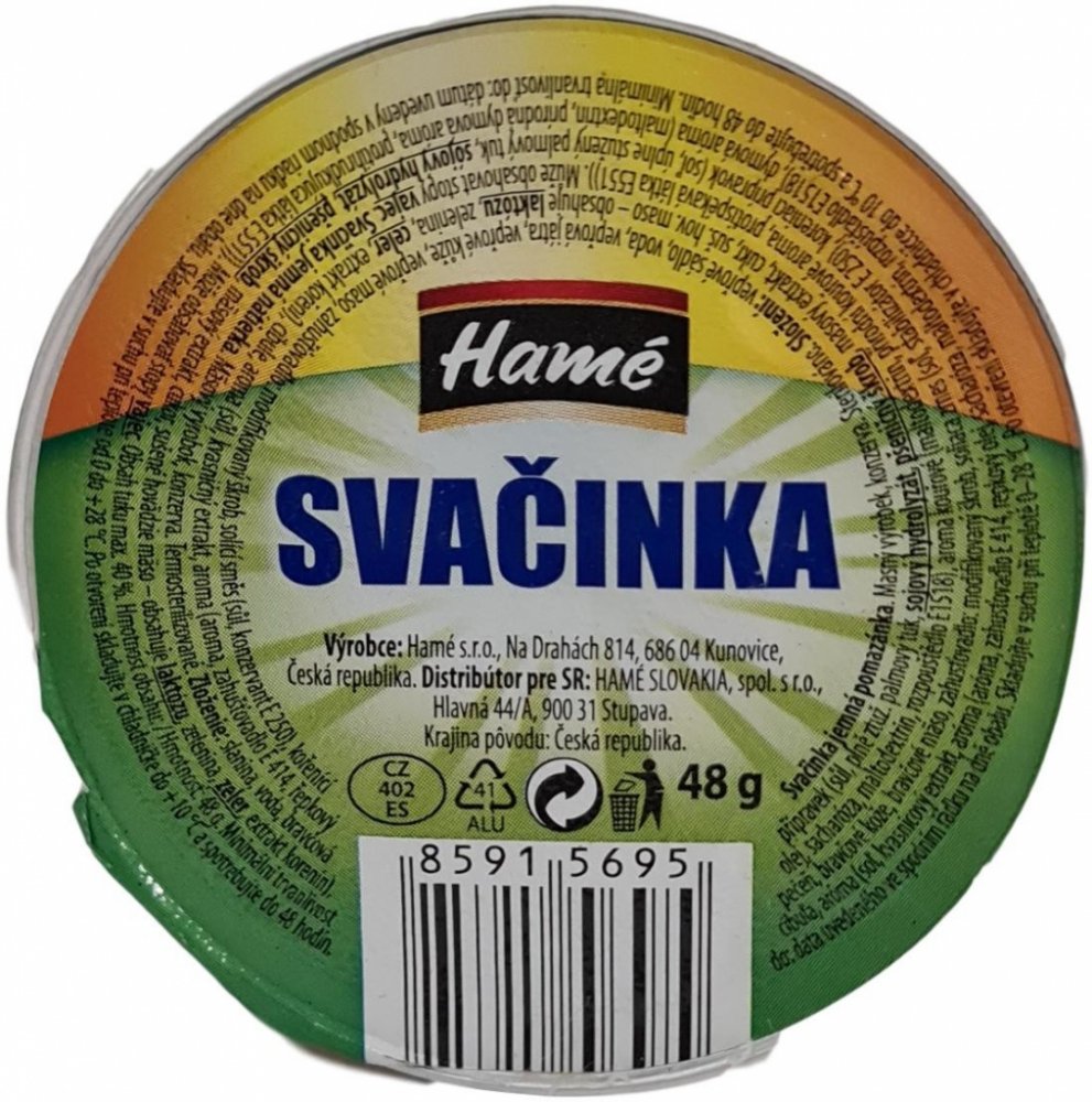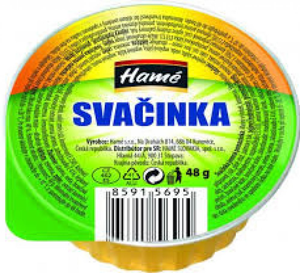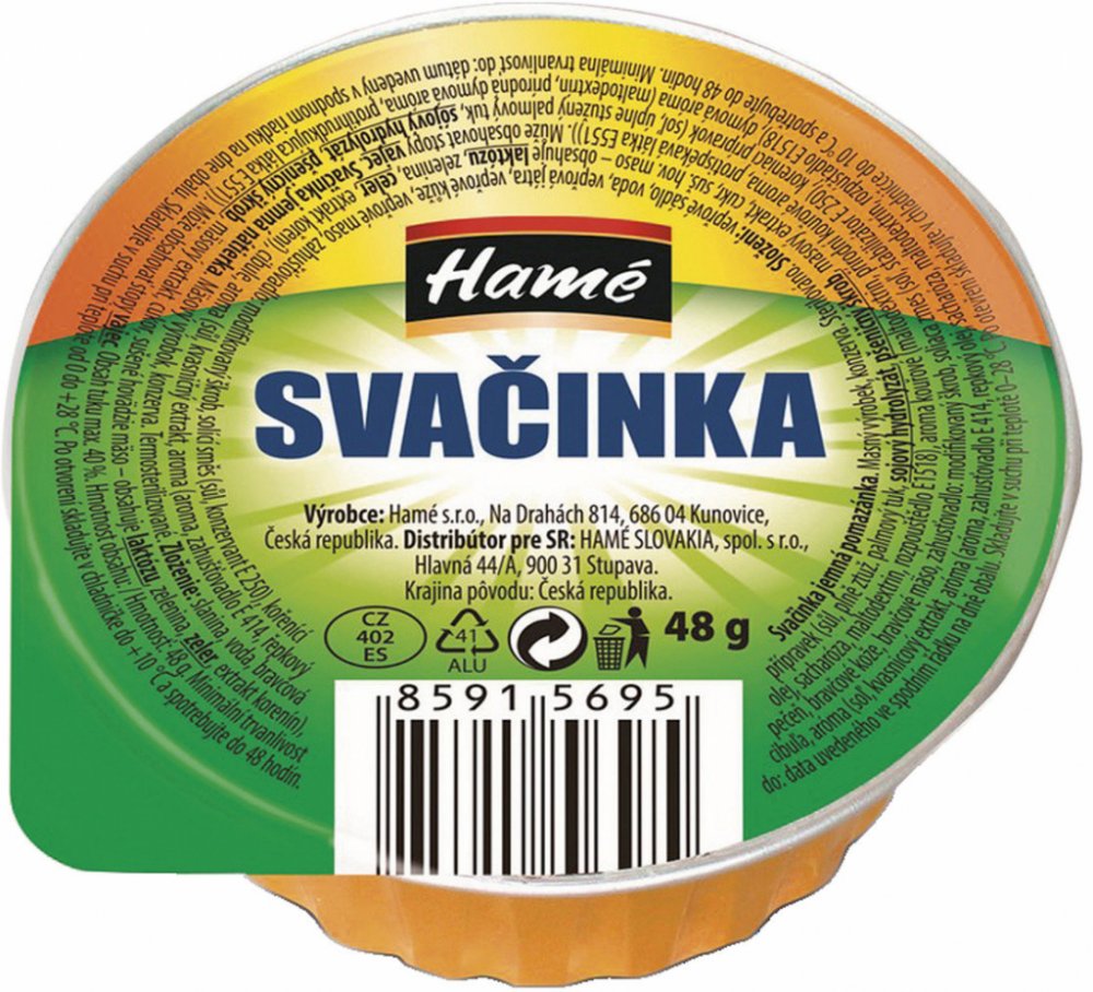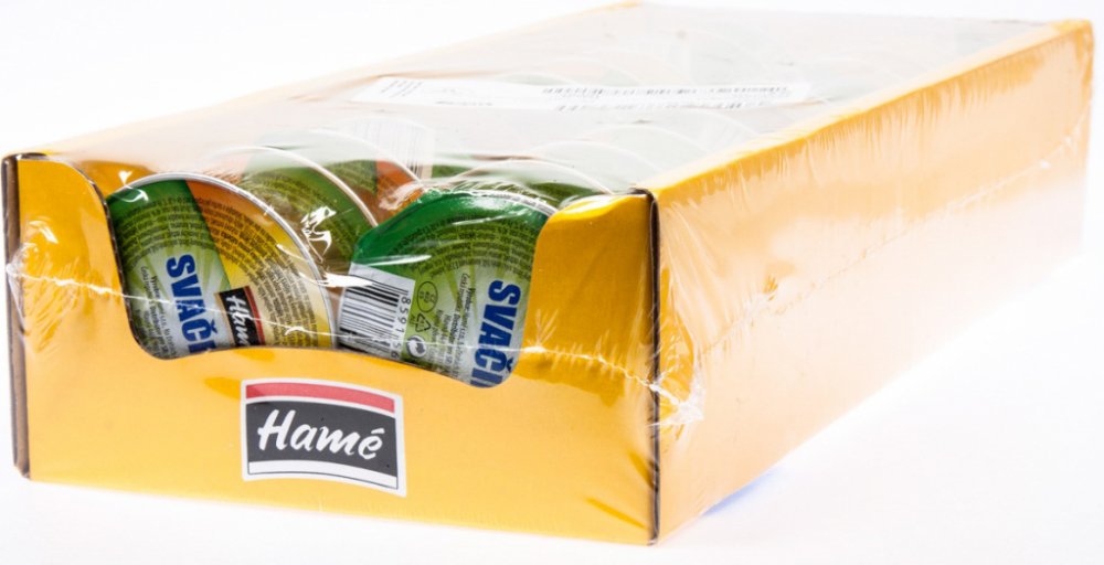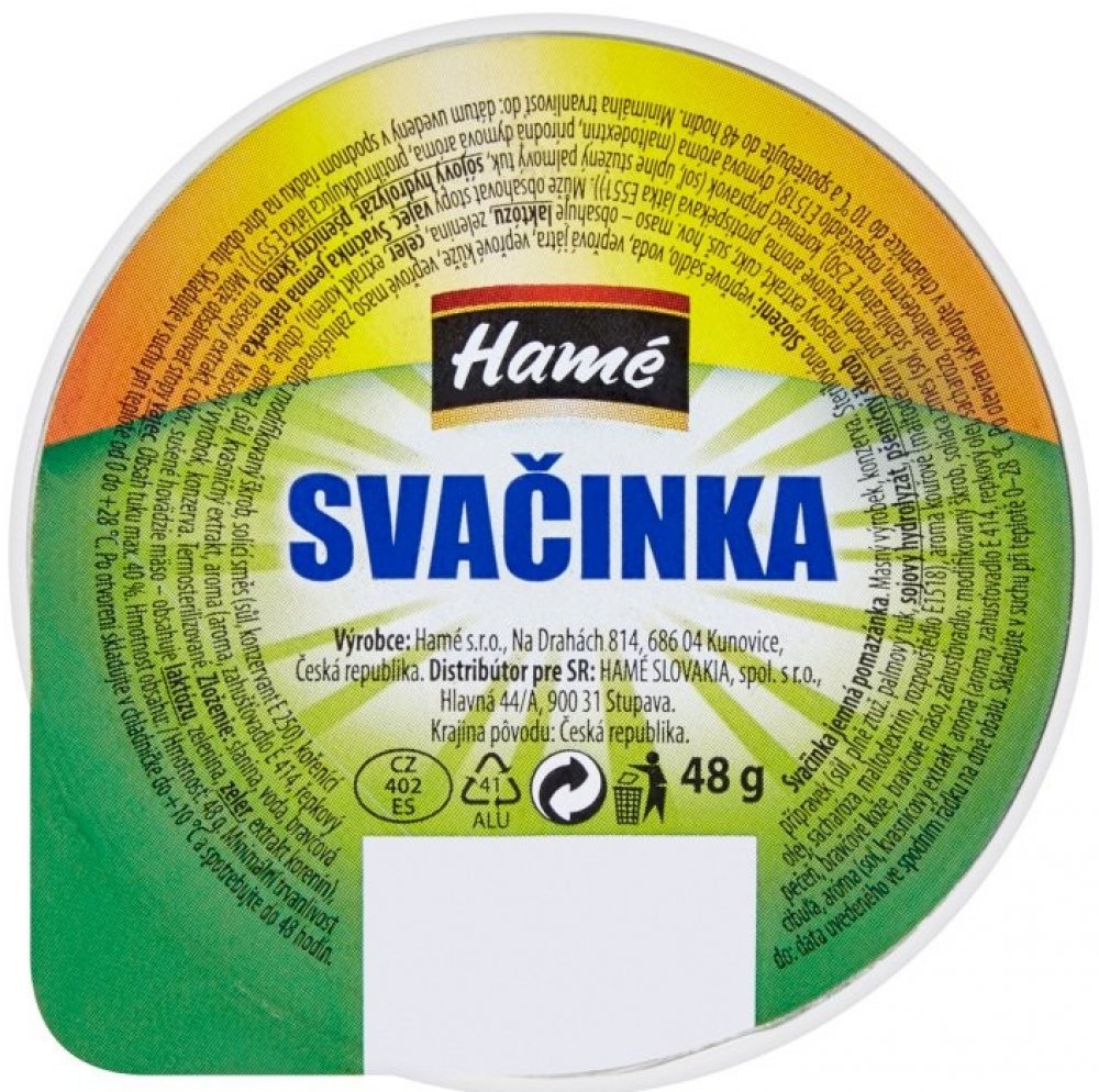 Vepřové sádlo, Voda, Vepřová játra, Vepřové kůže, Vepřové maso, Zahušťovadlo: modifikovaný škrob, Solící směs (sůl, konzervant E 250), Kořenící přípravek (sůl, plně ztuž. palmový tuk, sojový hydrolyzát, pšeničný škrob, masový extrakt, cukr, suš. hov. maso - obsahuje laktózu, zelenina, celer, extrakt koření), Cibule, Aroma (sůl, kvasničný extrakt, aroma (aroma, zahušťovadlo E 414, řepkový o...