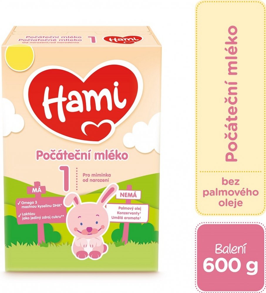 Počáteční kojenecké mléko Hami 1 je určené pro miminka již od narození až do 6 měsíců věku. Mléko obsahuje omega 3 mastnou kyselinu DHA* a laktózu, která je jediným zdrojem cukru. Neobsahuje palmový olej, konzervanty ani umělá aromata**.