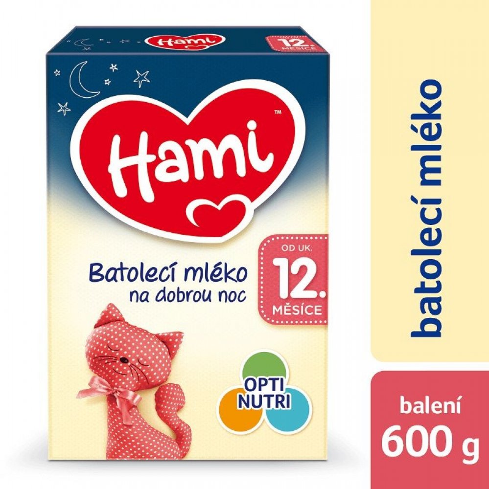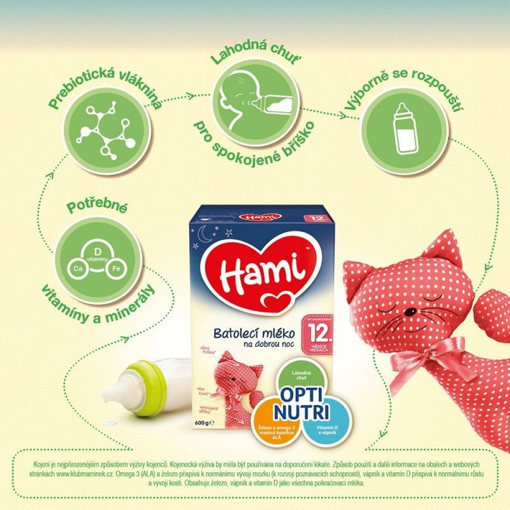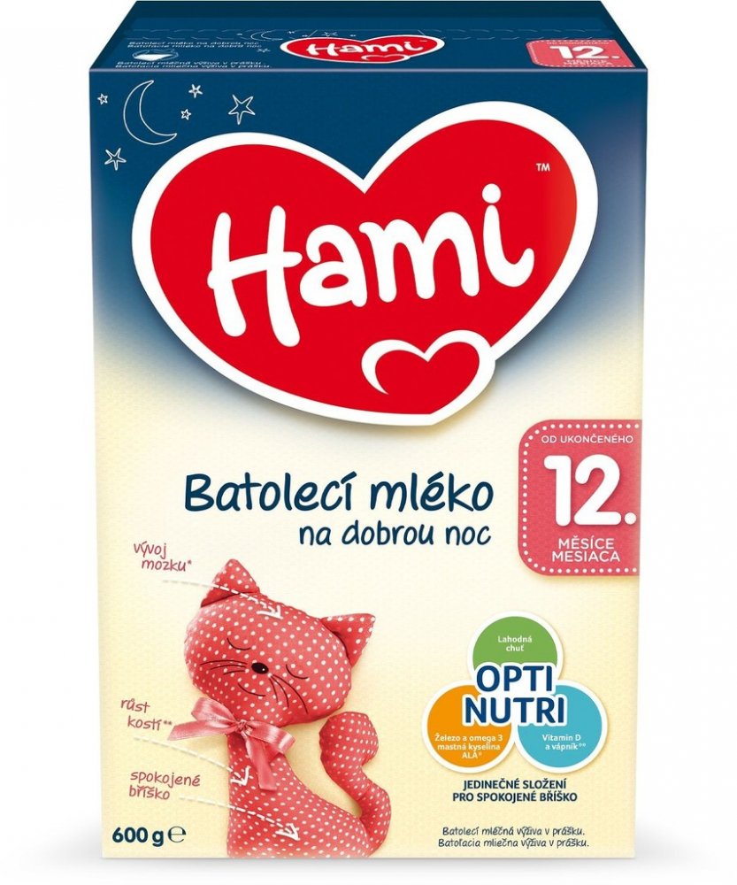 Informace o výrobku Každý nový zážitek začíná spokojeným bříškem. Prožijte to s mléky Hami. Batolecí mléko Hami na dobrou noc od ukončeného 12. měsíce obsahuje rýžové vločky, díky kterým je mléko hutnější než běžné batolecí mléko při stejné energetické hodnotě. Mléko je vhodné dávat před spaním jako večerní lahvičku pro spokojené bříško. Hami mléko na dobrou noc od uk. 12. měsíce má jedinečné složení s OptiNutri, díky kterému dodá děťátku potřebné živiny pro správný růst a vývoj a pro spokojené bříško. Navíc obsahuje vlákninu GOS/FOS. Železo a omega 3 mastná kyselina ALA* Vývoj mozku* Vitamin D a vápník** Růst kostí** *železo pro normální vývoj mozku (přispívá k rozvoji poznávacích funkcí) **vápník a vitamín D pro normální růst a vývoj kostí Informace o značce Hami Batolecí mléko 24+ - Po 24. měsíci pokračujte s batolecím mlékem. V České republice jsme získali ocenění nejdůvěryhodnější značka - Dětská výživa 2015. Železo a omega 3 mastná kyselina ALA*,Vitamin D a vápník**,*železo pro normální vývoj mozku (přispívá k rozvoji poznávácích funkcí),**vápník a vitamín D pro normální růst a vývoj kostí Od ukončeného 12. měsíce Jedinečné složení pro spokojené bříško Optinutri Lahodná chuť Spokojené bříško Příprava a použití Uchovávání Po každém použití obal pečlivě uzavřete a uchovávejte na suchém a chladném místě (ne v ledničce). Nevkládejte do mléčného prášku vlhkou odměrku. Obsah spotřebujte do 1 měsíce po otevření. Návod na přípravu 1. Vysterilizujte všechno používané nádobí a převařte pitnou vodu určenou pro kojence. Nechte ji v konvici vychladnout asi 30 minut na přibližně 40 °C. 2. Odpovídající množství převařené vody (viz tabulka) vlijte do vysterilizované láhve. 3. Do láhve s vodou přidejte odpovídající množství prášku (viz tabulka). Na dávkování vždy používejte přiloženou odměrku. Prášek v ní zarovnejte pomocí ploché části nože. Uzavřete lahev a cca 10 sekund ji protřepejte. 4. Před podáváním ověřte teplotu mléčné směsi kápnutím na vnitřní stranu zápěstí a ihned podávejte. Doporučené dávkování (podle dětského lékaře) Přesné množství mléka pro vaše děťátko vám poradí pediatr. Příprava jedné dávky Výsledná dávka (ml) / Počet zarovnaných odměrek / Voda (ml) 100 ml / 3 / 90 266 ml / 8 / 240 1 zarovnaná odměrka = 5 g sušeného přípravku. Doporučené množství batolecího mléka od uk. 12. měsíce jsou alespoň 2 lahvičky denně.