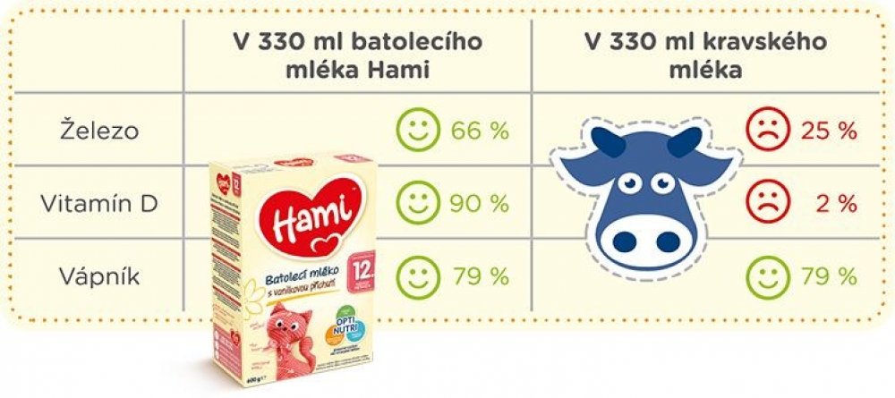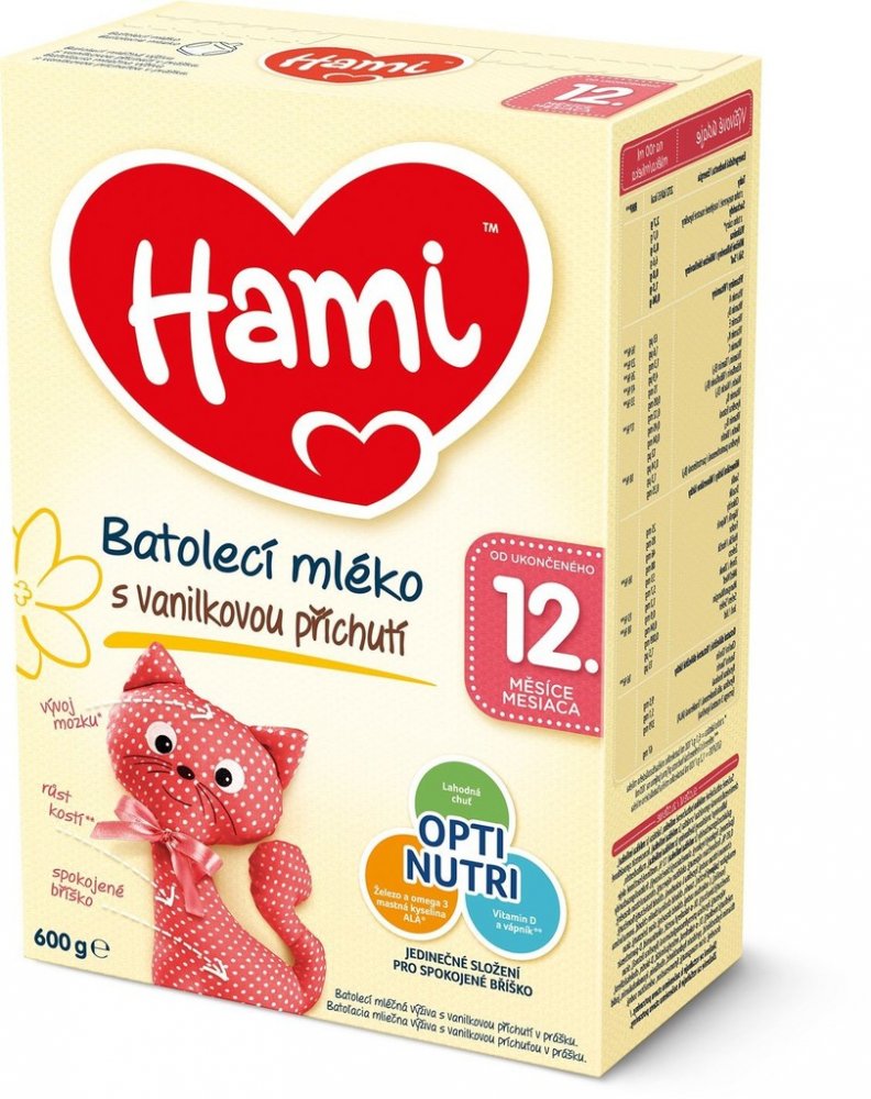 A v čem je batolecí mléko Hami 12+ s vanilkovou příchutí tak jedinečné? Batolecí mléko Hami od ukončeného 12. měsíce s vanilkovou příchutí má jedinečné složení s OptiNutri, díky kterému dodá děťátku potřebné živiny, aby mohlo naplno objevovat svět kolem sebe a společně s vámi zažívat nová dobrodružství. Má navíc lahodnou vanilkovou příchuť pro malé bříško vašeho gurmána. Nadchne vás i příjemná vanilková vůně mléčného prášku a připraveného batolecího mléka. S batolecím mlékem Hami vám půjde i příprava velmi rychle od ruky. Prášek se velmi dobře rozpouští, nehrudkovatí a příjemně voní stejně jako hotové mléko. Mléko tak budete mít připraveno raz dva a vaše děťátko si na něm pochutná! Batolecí mléko Hami se složením OptiNutri obsahuje: