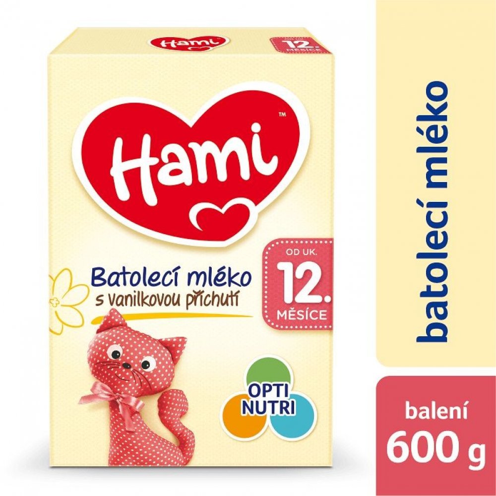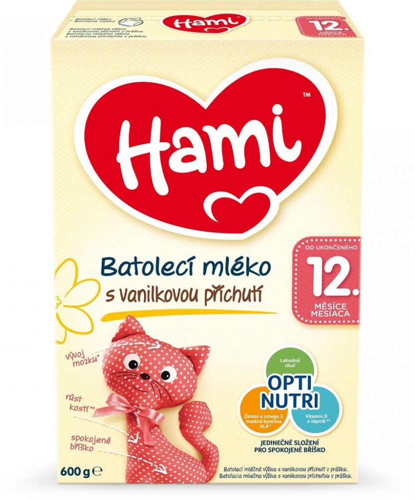 Batolecí mléko Hami 12+ s oblíbenou vanilkovou příchutí o obsahu 600 g je vhodné pro miminka od ukončeného 12. do 24 měsíce. Pokud Vašemu děťátku nechutná batolecí mléko bez příchuti, naše Hami mléko s vanilkovou příchutí bude skvělým řešením. Nejen, že příjemně voní, ale lahodná vanilková příchuť patří u dětí k těm nejoblíbenějším, takže se po mlíčku jen zapráší. Mléko obsahuje potřebné vitaminy a minerály pro správný růst a vývoj* vašeho děťátka a navíc skvěle chutná!
