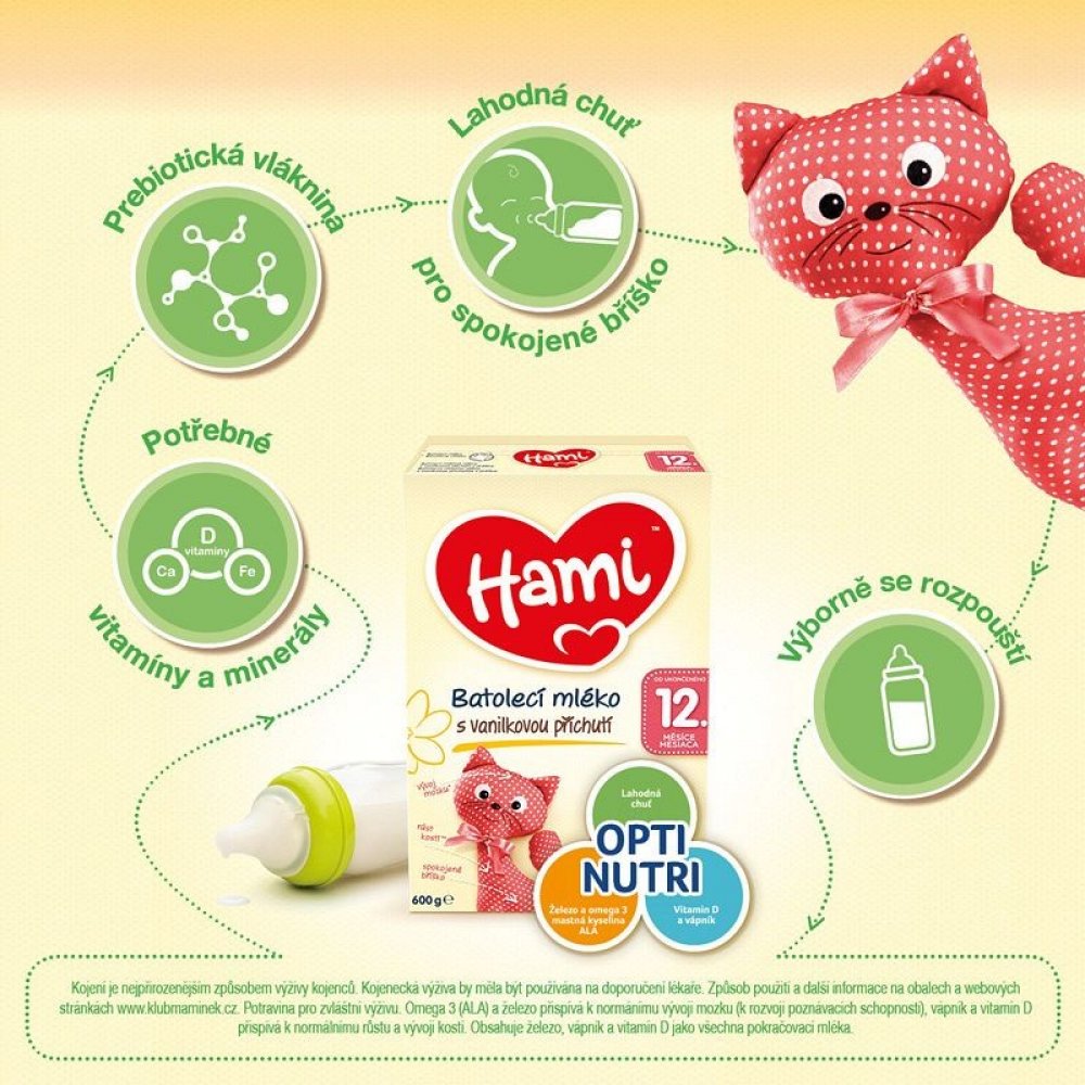 Hami mléko od ukončeného 12. měsíce je určené pro výživu malých dětí od 1 roku jako součást smíšené a vyvážené stravy dítěte. Dohlédněte na hygienu ústní dutiny v období růstu prvních zoubků, především před spaním. Pro zdraví dítěte je důležité dodržování návodu na přípravu a uvedených doporučení. Hami mléko od ukončeného 12. měsíce není určené pro výživu kojenců do 1 roku. Potravina pro zvláštní výživu.