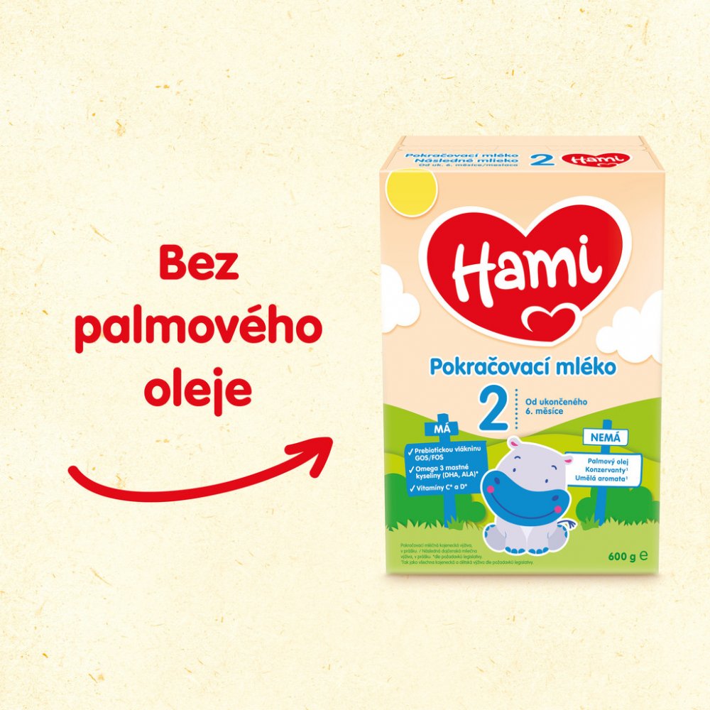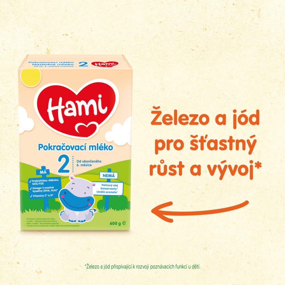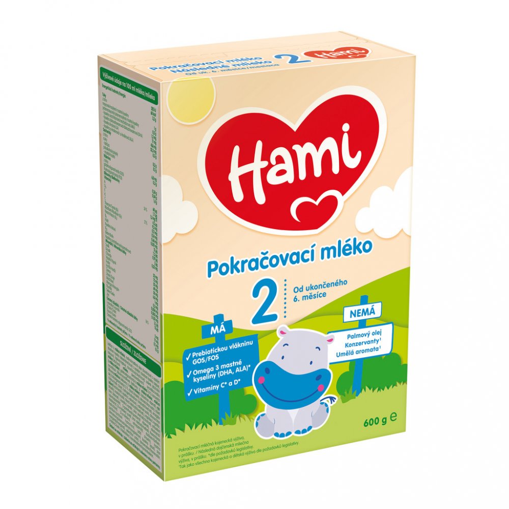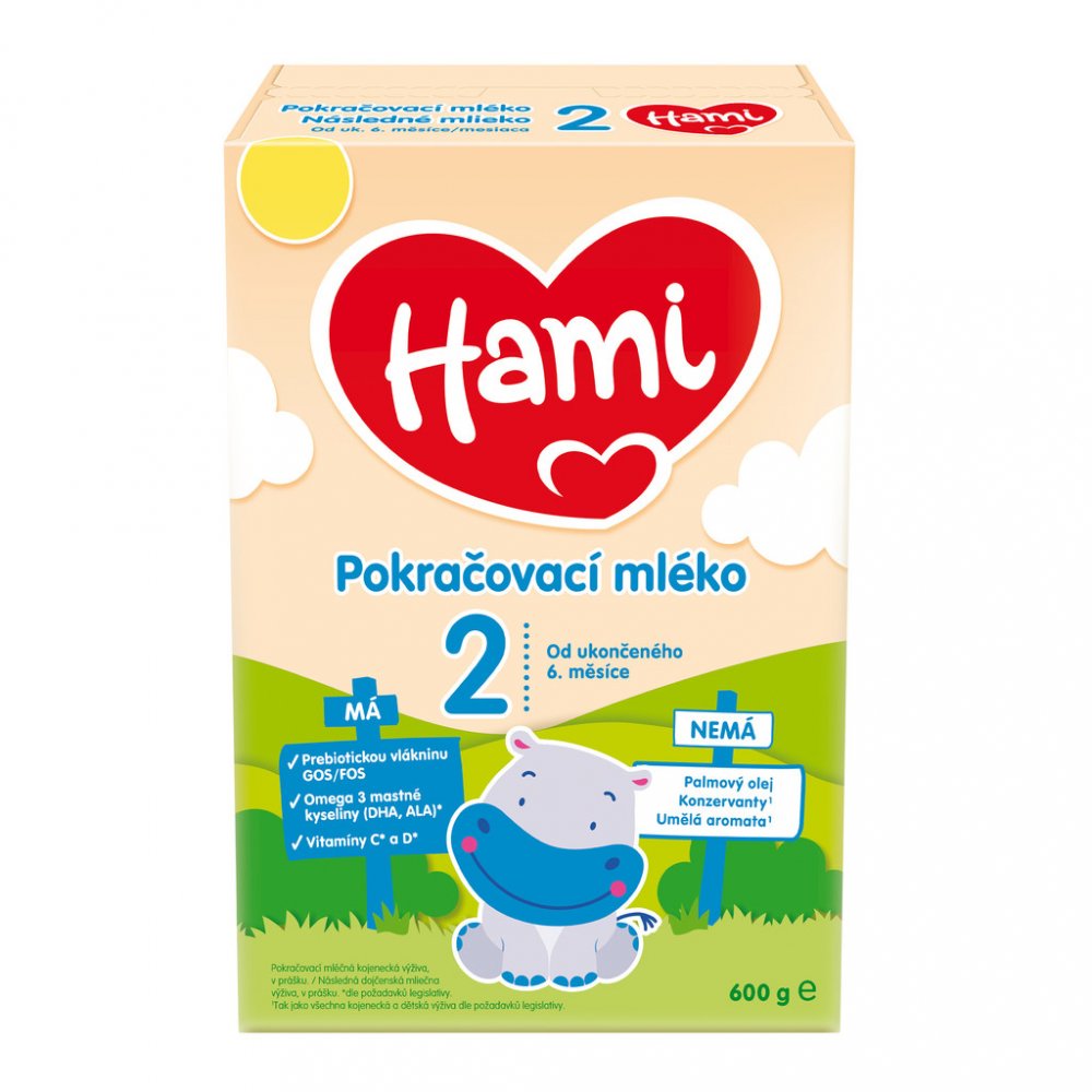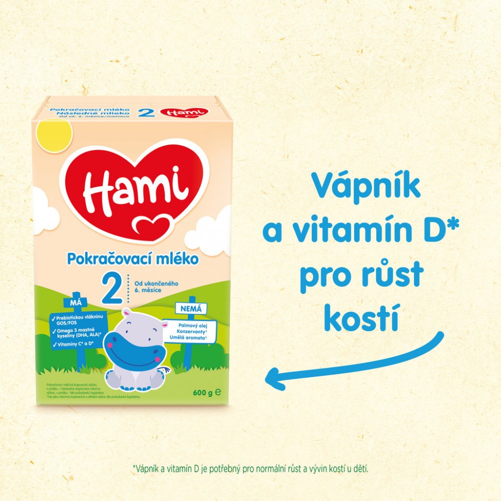 2 Pokračovací mléka Hami 2 obsahují vitamin D potřebný pro správný růst a vývin kostí u dětí, Omega3 mastnou kyselinu alfa-linolenovou (ALA) přispívající k rozvoji mozku a nervové soustavy a jód přispívající k rozvoji poznávacích funkcí u dětí. Vitaminy C a D přispívají k normální funkci imunitního systému. Všechna pokračovací mléka obsahují vitaminy C a D, jód i ALA dle požadavků legislativy.