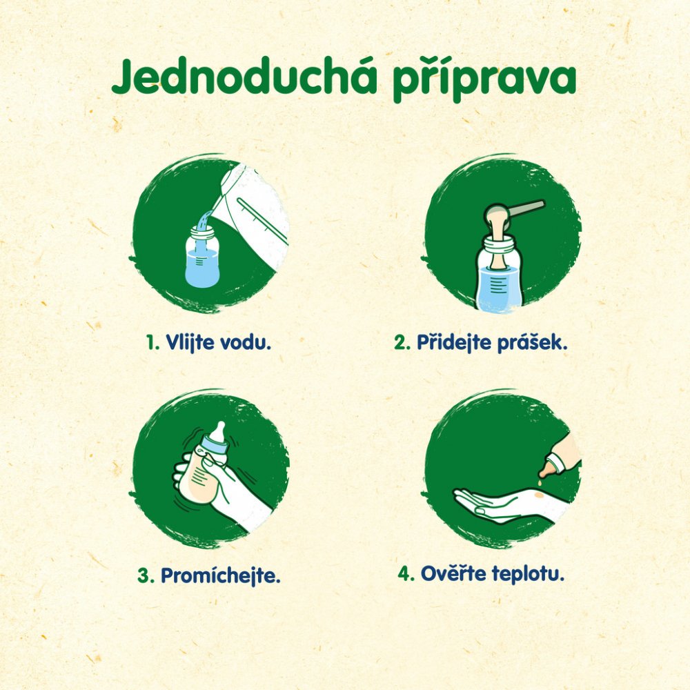 Kojení je nejlepším způsobem výživy kojenců. Potravina pro zvláštní výživu kojenců starších 6 měsíců. Má být pouze součástí smíšené a vyvážené stravy, nemá se používat jako náhrada mateřského mléka během prvních 6 měsíců života. Rozhodnutí o zahájení podávání příkrmů, včetně jakékoli výjimky z pravidla věku 6 měsíců, by mělo být přijímáno jen na radu nezávislých osob kvalifikovaných v lékařství, výživě nebo farmacii nebo jiných odborníku odpovědných za péči o matku a dítě, v závislosti na individuálním růstu a rozvojových potřebách konkrétního kojence. Pro zdraví kojenců je důležité dodržovat návod na přípravu a uvedená doporučení. Vyvarujte se dlouhému kontaktu mléčné výživy se zoubky - zvyšuje riziko výskytu zubního kazu. Pečujte pravidelně o zoubky dítěte, zejména před spaním. Požádejte o radu zubního lékaře.