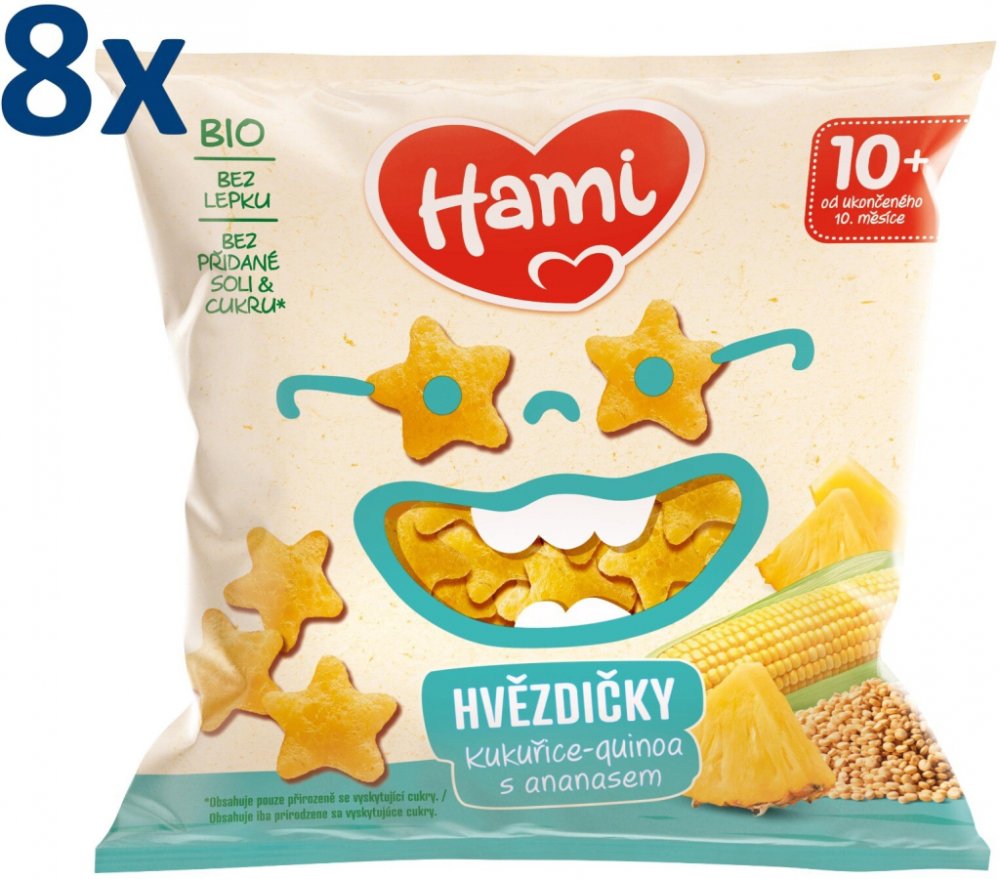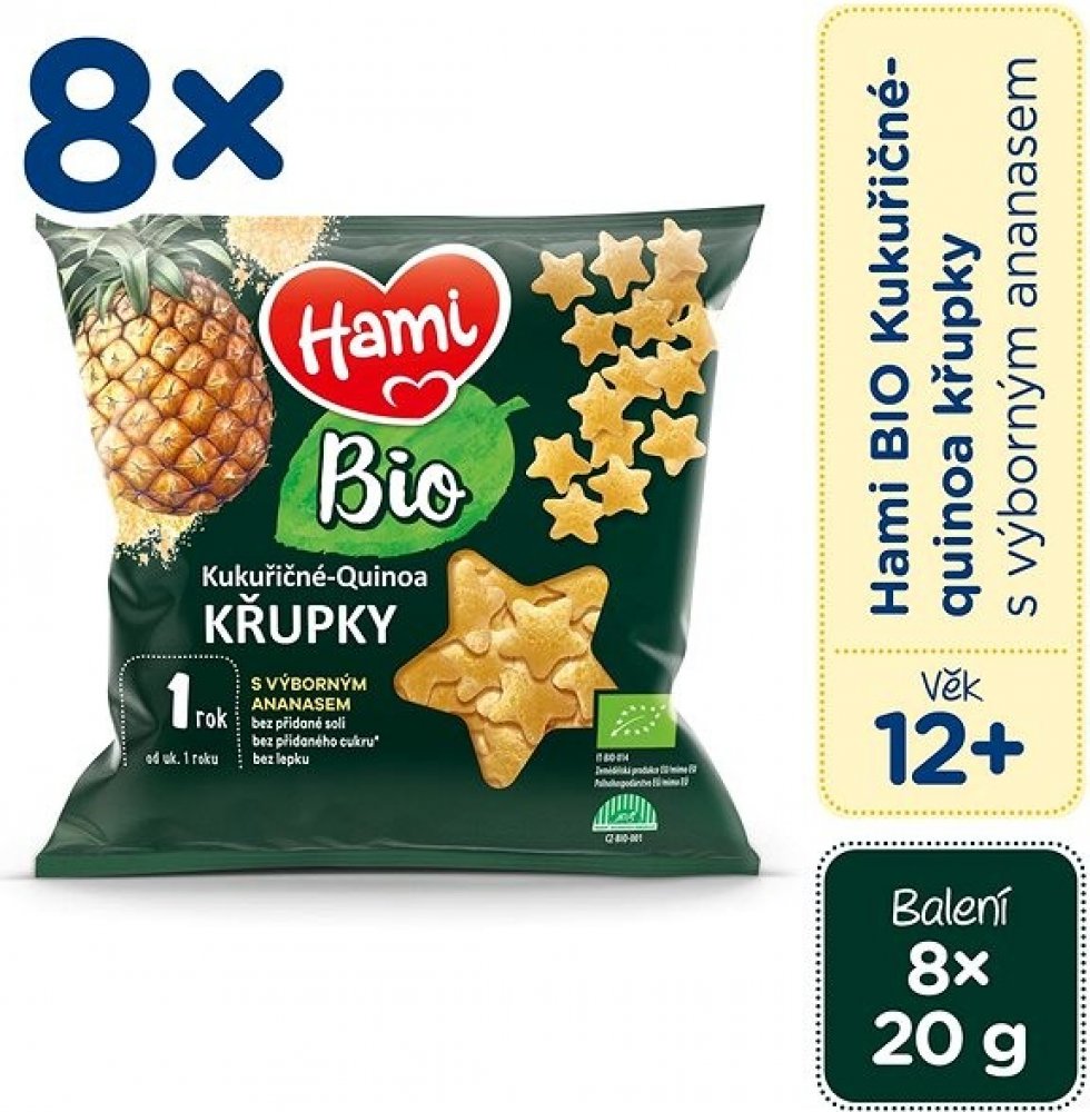 HAMI BIO kukuřičné-quinoa křupky s ananasem Nové Hami BIO Kukuřičné-Quinoa křupky s výborným ananasem jsou vhodné pro dětičky od ukončeného 1 roku věku. Svým hravým tvarem, chutí a velikostí si je vaši malí jedlíci rychle zamilují! Díky své konzistenci se křupky snadno rozplynou v ústech, ale zároveň podpoří rozvoj žvýkání. Nikdy ale nenechávejte své neposedy chroupat bez dozoru, protože by jim mohli kousky zaskočit. Již od prvního zoubku pravidelně pečujte o chrup dítěte, přispějete tak k jeho ochraně před zubním kazem. Od 12. měsíce Vhodné od 8× 20 g Velikost balení Křupky Typ příkrmu Klíčové vlastnosti HAMI BIO kukuřičných-quinoa křupek s ananasem 8× 20 g, 12+Tvar přizpůsobený malým ručičkámVhodné při nácviku žvýkáníLahodná svačinka doma, na procházce i na cestáchZ certifikovaných BIO surovinBez lepkuBez přidané soliBez přidaného cukruVýživové hodnoty na 100 g...