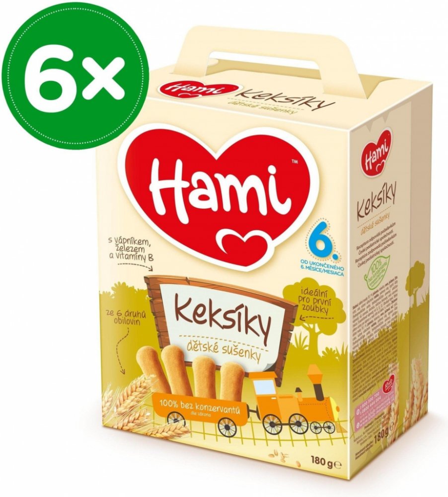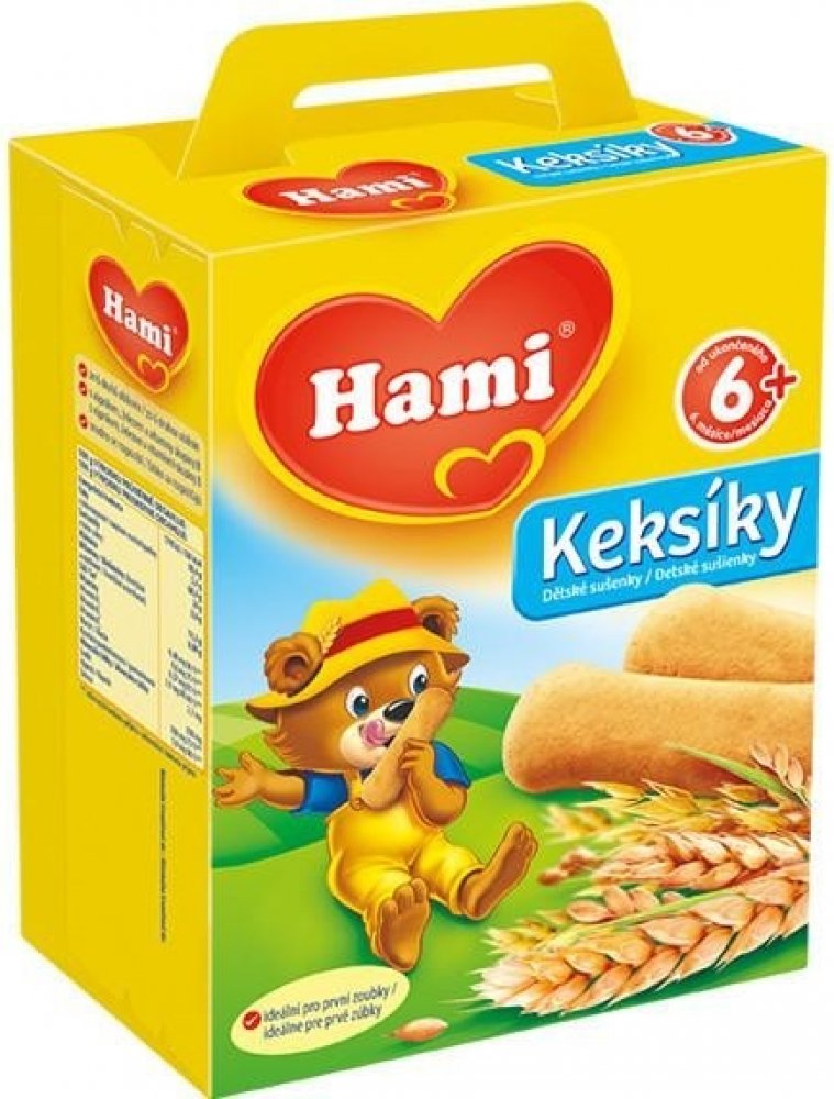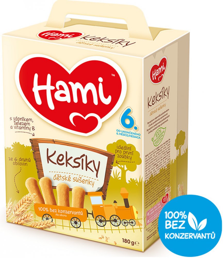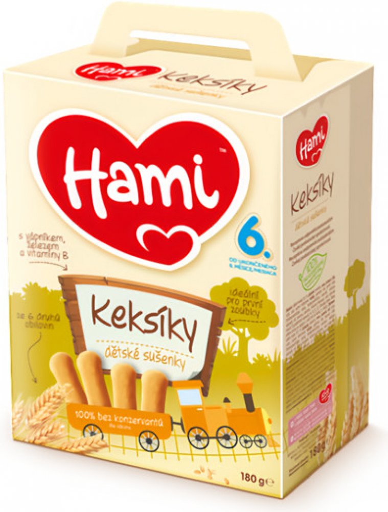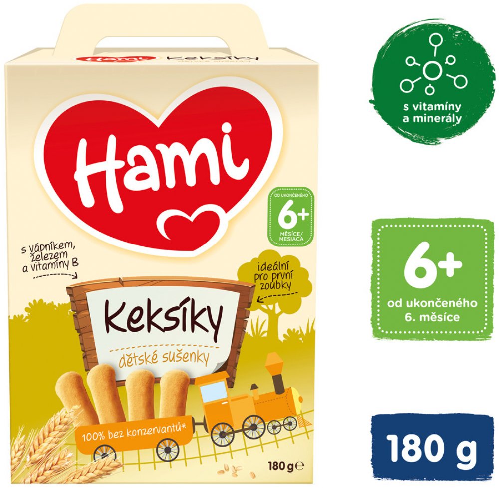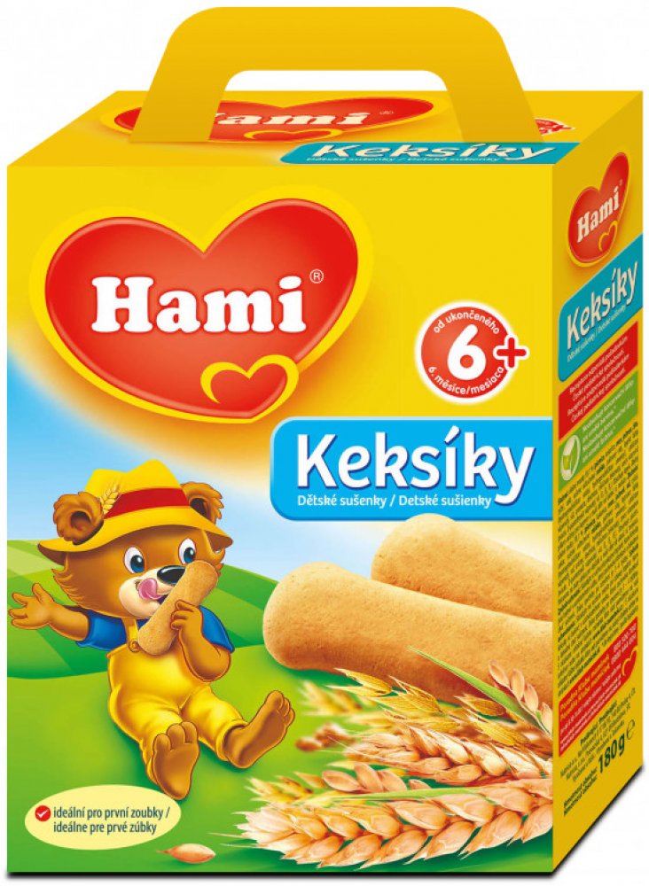 Obilné křupavé sušenky Obilné křupavé sušenky Hami Keksíky jsou vyrobené ze 6 druhů obilovin a obsahují vápník, železo a vitamíny skupiny B. Pro svou lahodnou chuť a lehkou stravitelnost jsou Hami Keksíky ideální jako doplněk snídaně nebo svačinky. Tvarem a velikostí jsou speciálně uzpůsobeny do malých dětských ručiček a v ústech se snadno rozpouští.