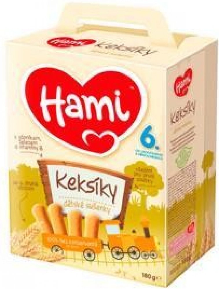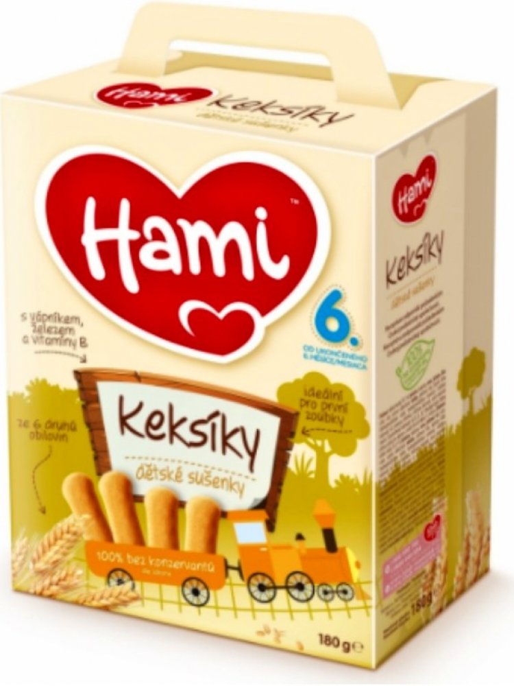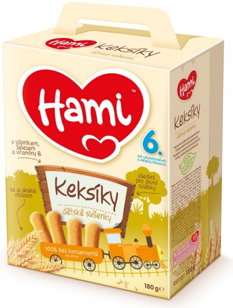 Obilné křupavé sušenky Hami Keksíky jsou vyrobené ze 6 druhů obilovin a obsahují vápník, železo a vitamíny skupiny B. Pro svou lahodnou chuť a lehkou stravitelnost jsou Hami Keksíky ideální jako doplněk snídaně nebo svačinky. Tvarem a velikostí jsou speciálně uzpůsobeny do malých dětských ručiček a v ústech se snadno rozpouští.