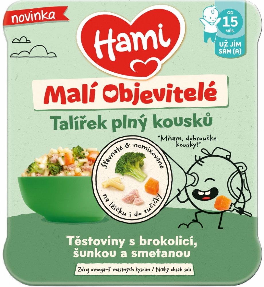 Hami Malí Objevitelé Těstoviny s brokolicí, šunkou a smetanou od 15. měsíců. Hami talířek Malí Objevitelé plný dobroučkých měkkých kousků pro větší děti, které už chtějí jíst samy lžičkou... nebo i rukama! Pro Vaše nejmenší jen to nejlepší:
