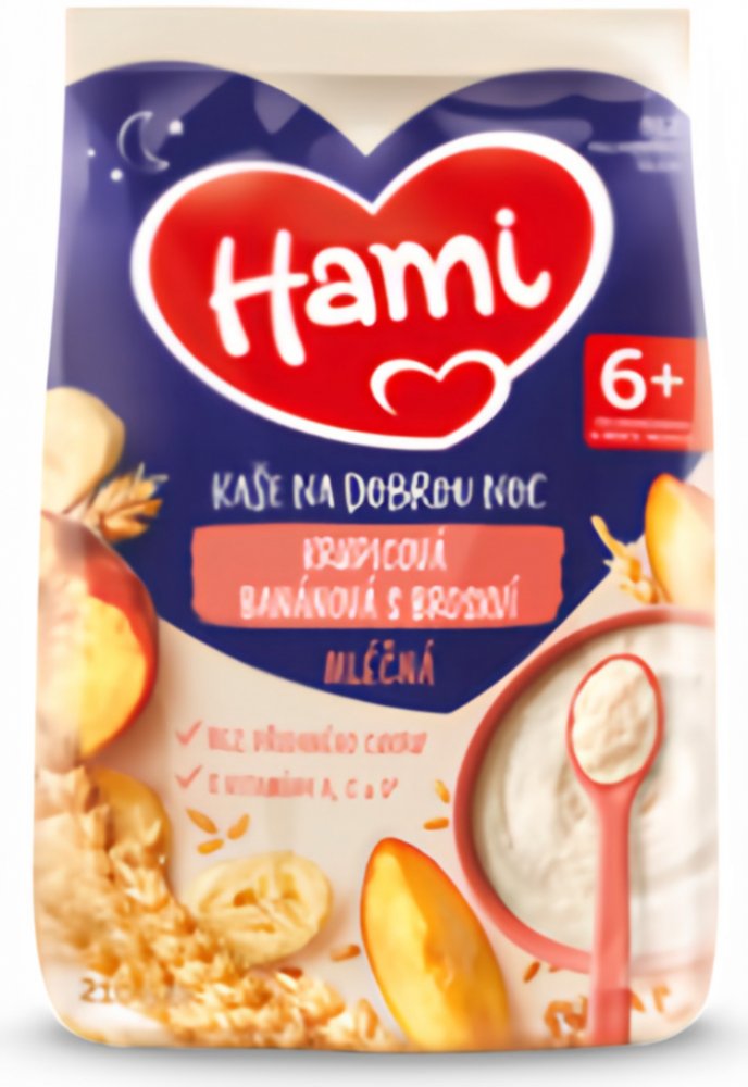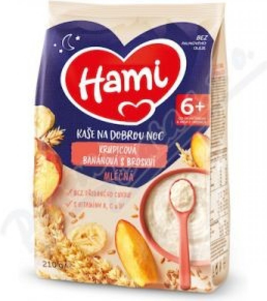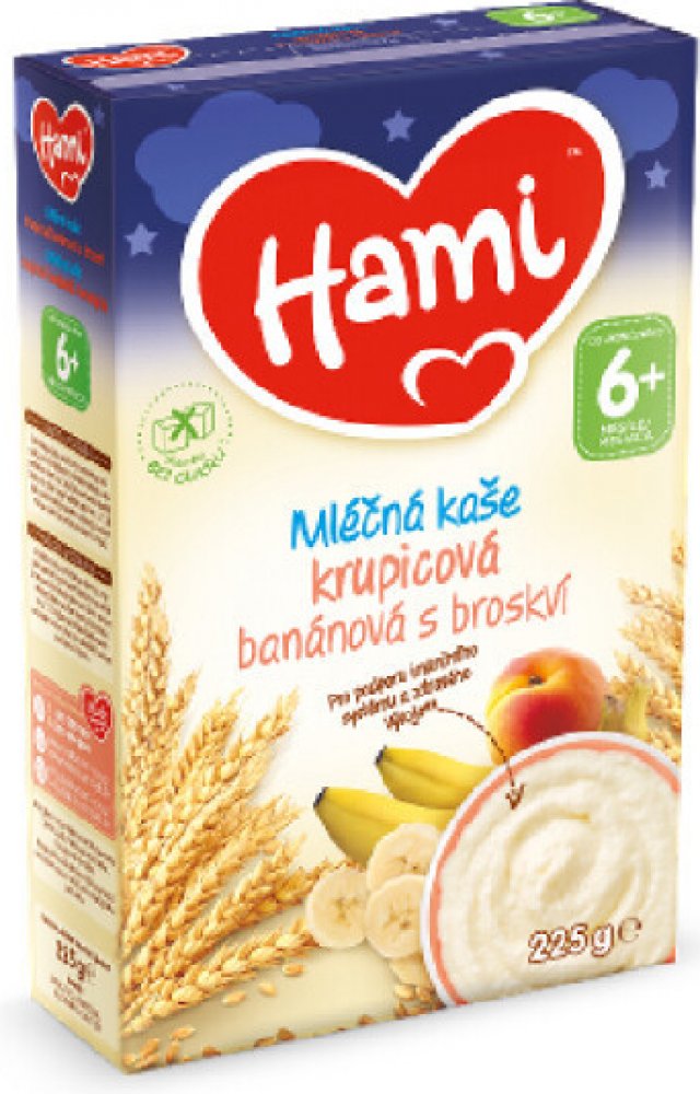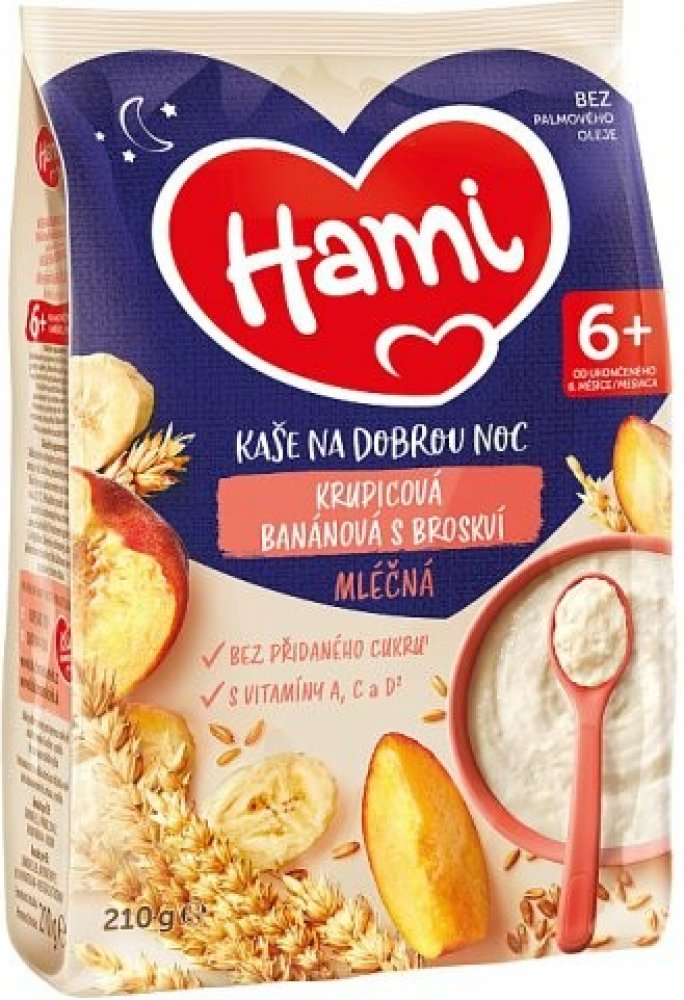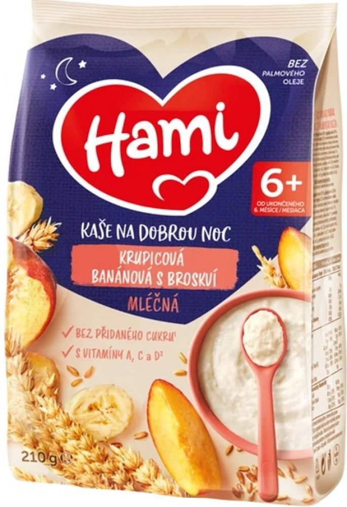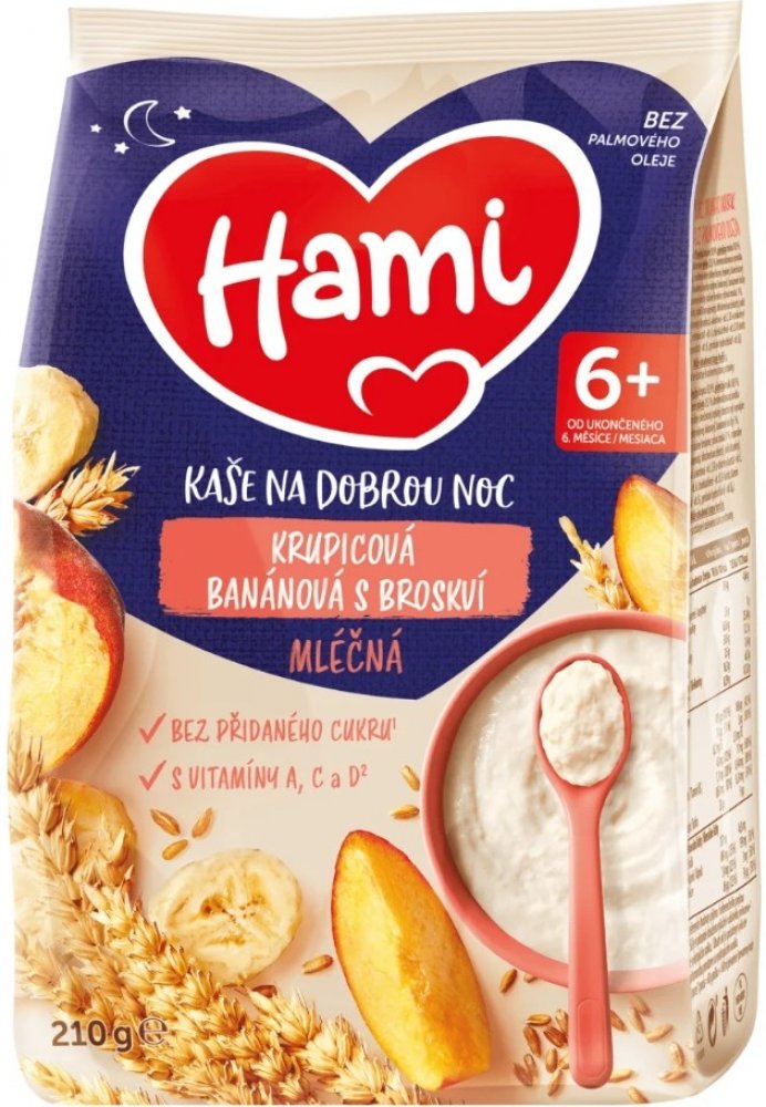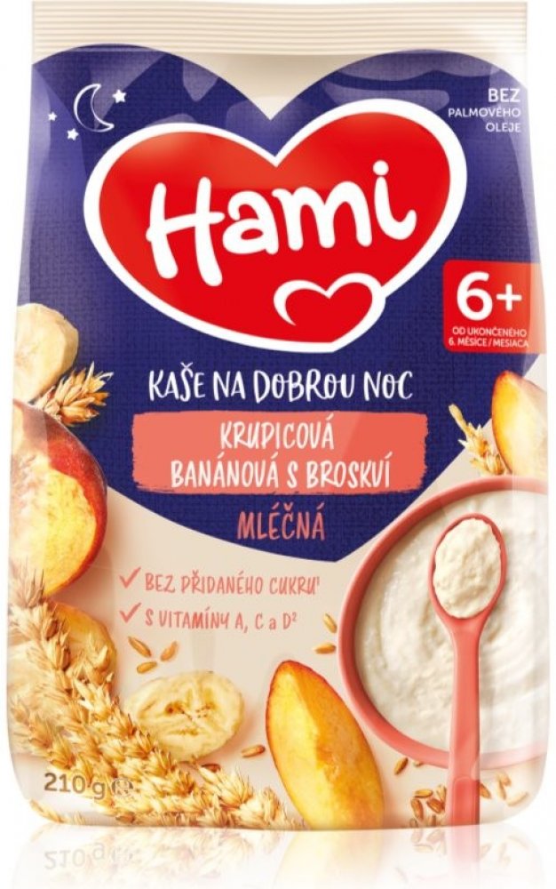 Víme, že výživa dítěte v prvních 1000 dnech života hraje klíčovou roli pro jeho zdraví v dospělosti, a proto s Hami můžete mít jistotu, že Vaše děťátko dostává tu správnou výživu.Hami mléčná kaše krupicová banánová s broskví na dobrou noc je vhodná jako chutná večeře ale i snídaně pro malá bříška. Obsahuje obilniny