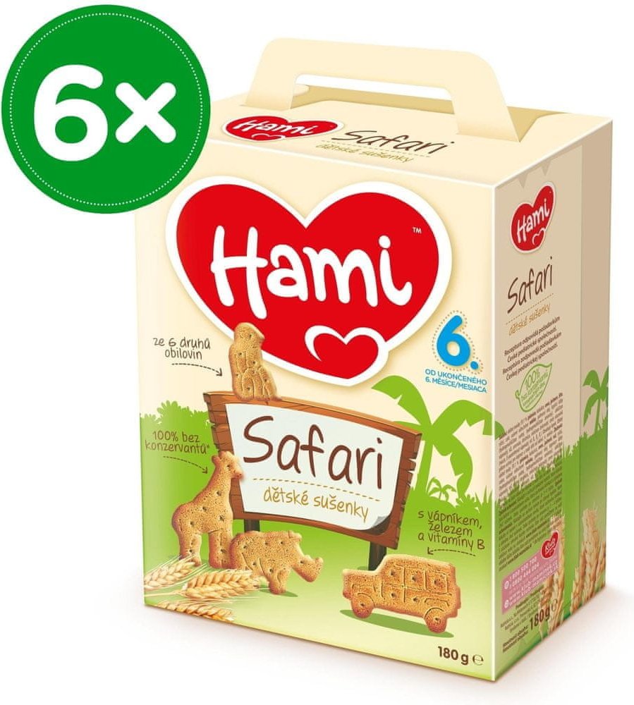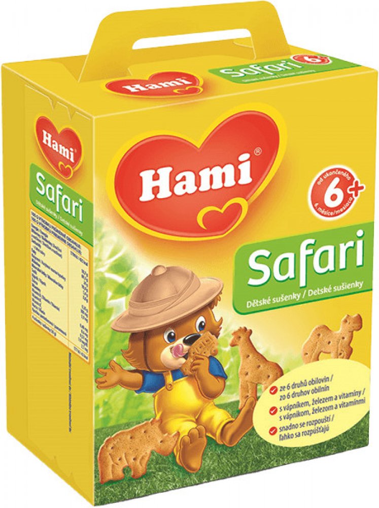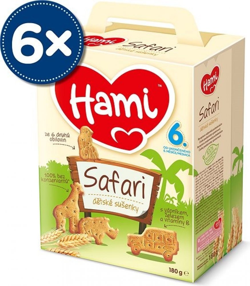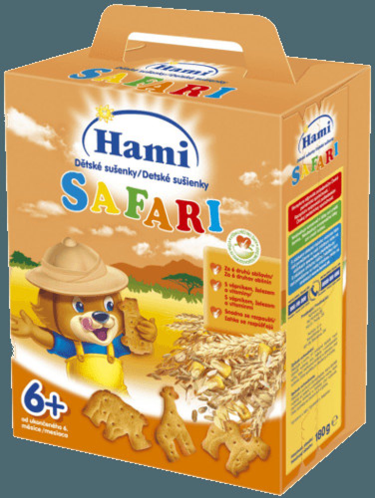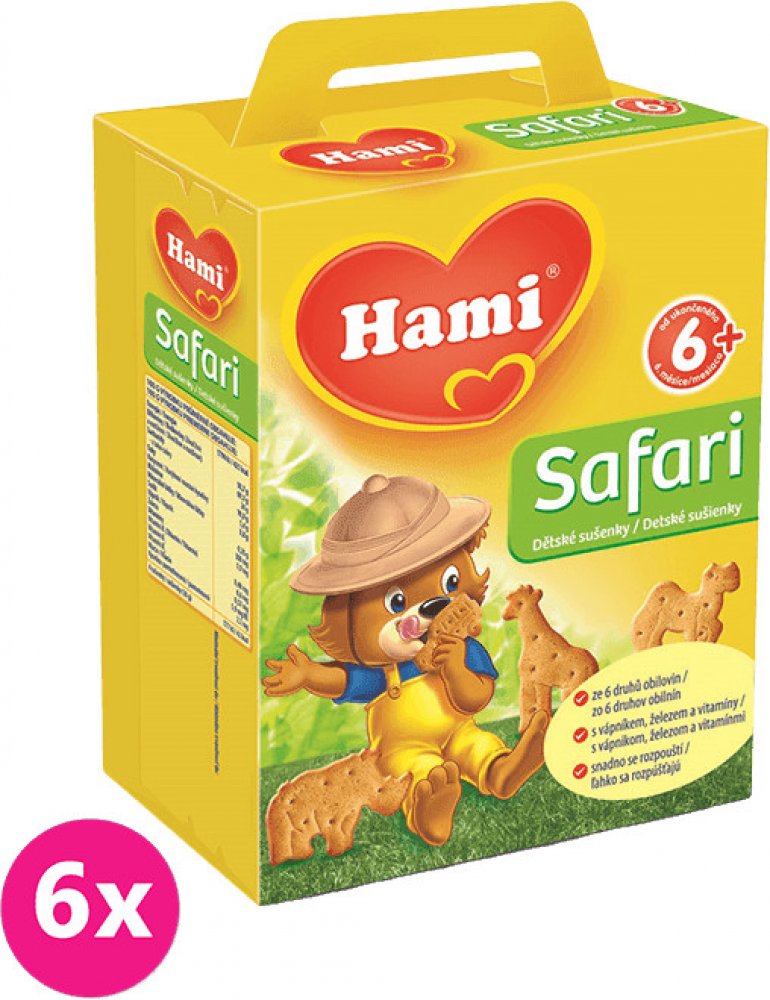 6× Hami Safari dětské sušenky180gPopis:Obilné křupavé sušenky Hami SAFARI poskytují dětem přirozený zdrojenergie ze 6 druhů obilovin a důležité vitaminy, vápník a železopotřebné. Hravý tvar sušenek ve formě zvířátek je speciálně uzpůsobendo malé dětské ručičky, takže se dětem dobře drží. Pro svou lahodnouchuť a lehkou stravitelnost jsou sušenky Hami SAFARI ideální jako doplněksnídaně nebo svačinky...