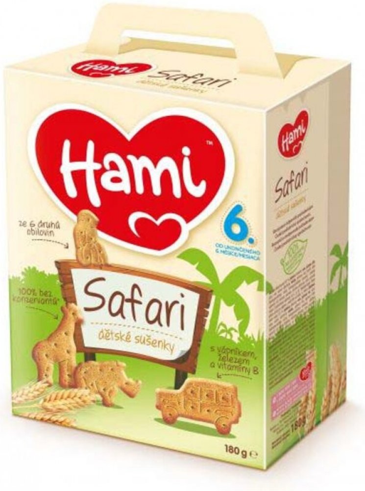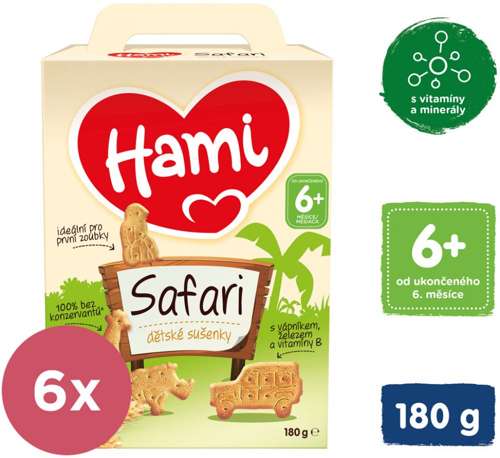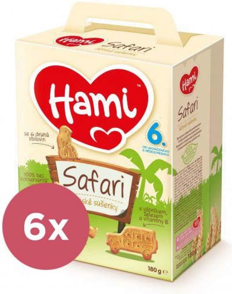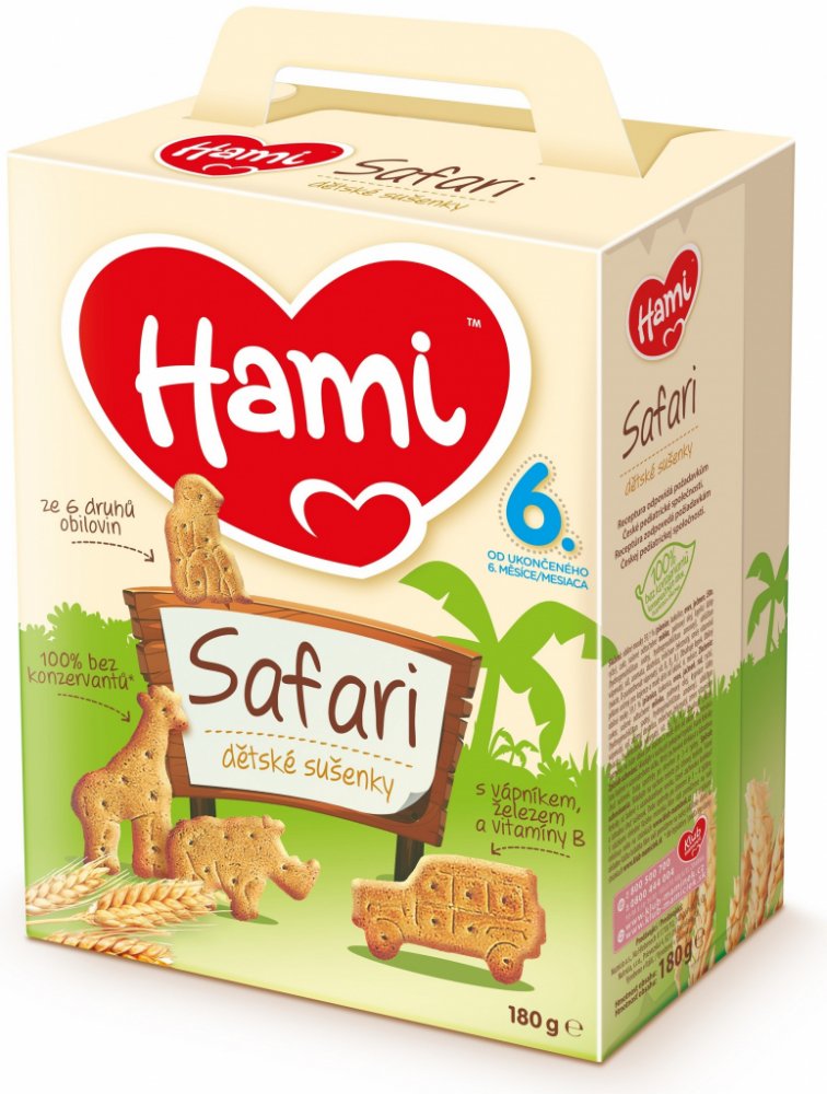 6× Hami Safari dětské sušenky180gPopis:Obilné křupavé sušenky Hami SAFARI poskytují dětem přirozený zdrojenergie ze 6 druhů obilovin a důležité vitaminy, vápník a železopotřebné. Hravý tvar sušenek ve formě zvířátek je speciálně uzpůsobendo malé dětské ručičky, takže se dětem dobře drží. Pro svou lahodnouchuť a lehkou stravitelnost jsou sušenky Hami SAFARI ideální jako doplněksnídaně nebo svačinky...
