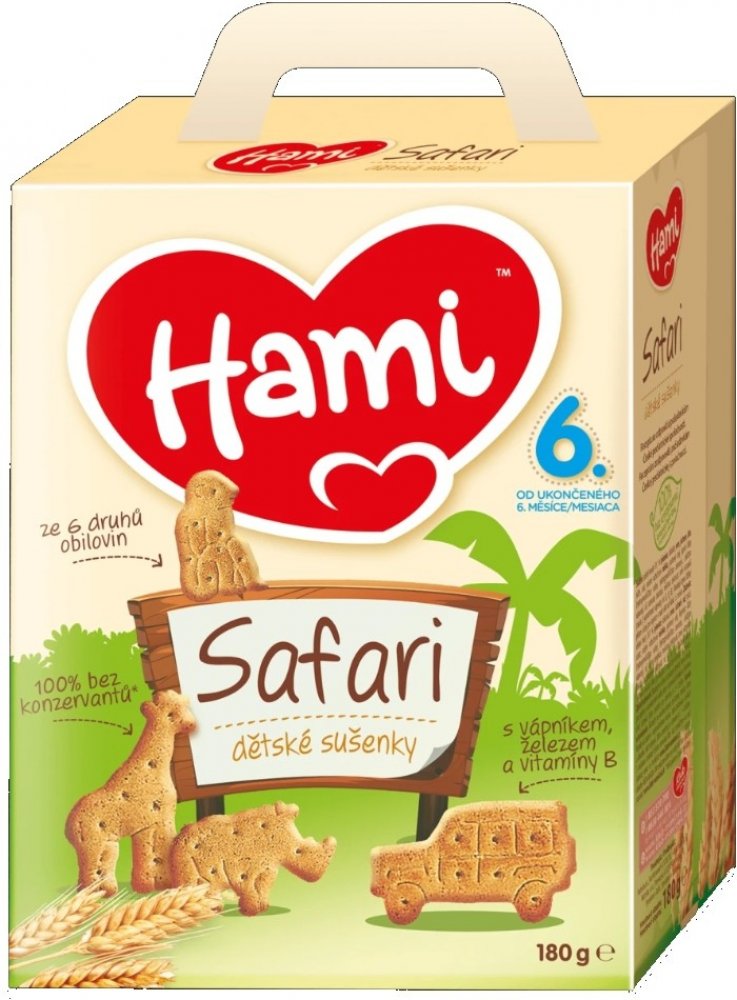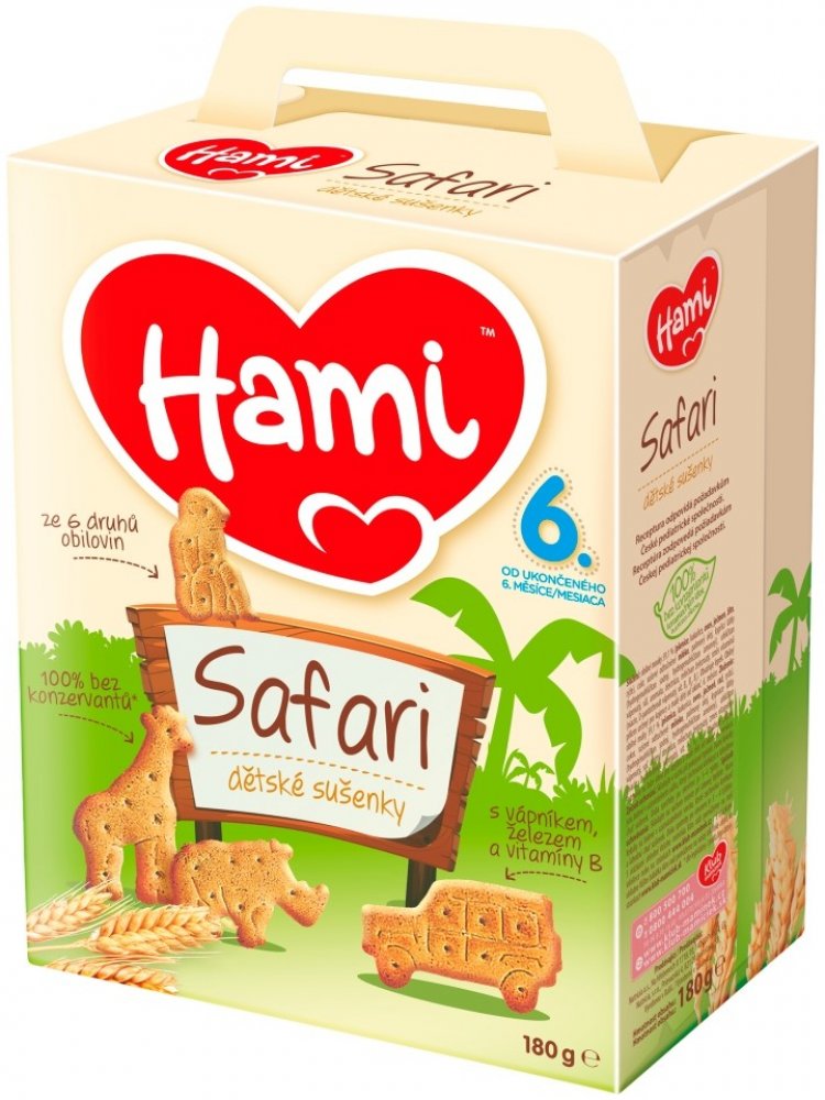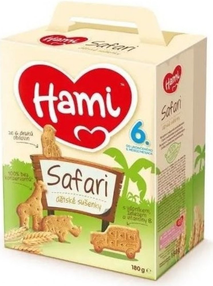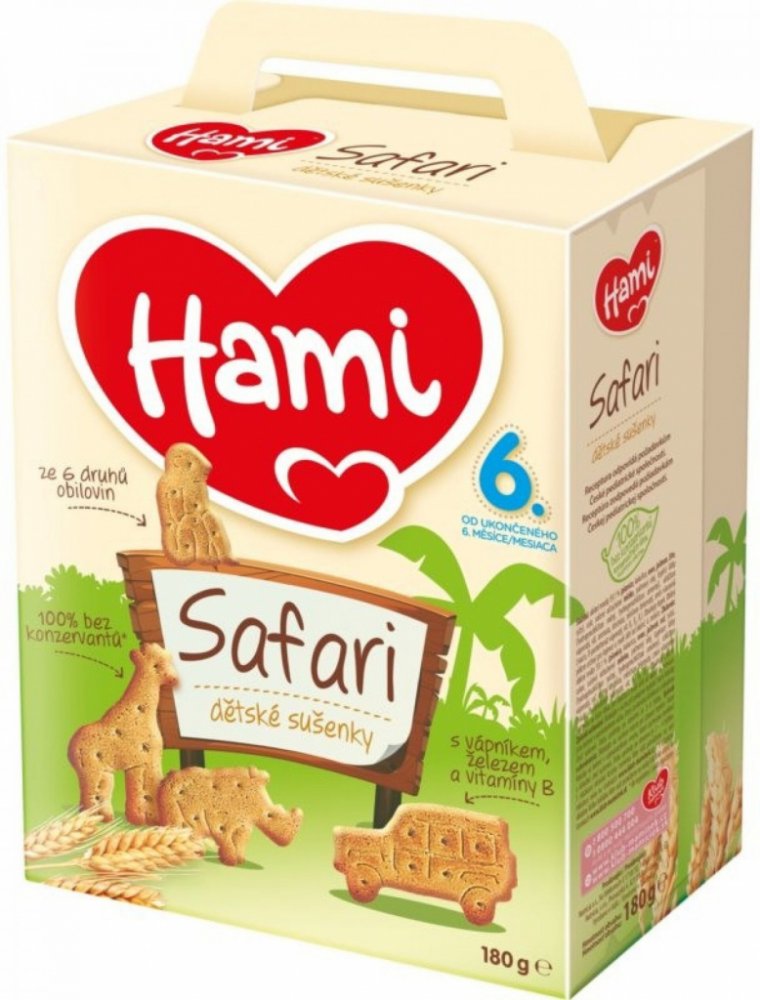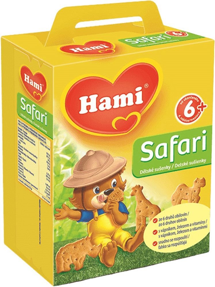 Hami Sušenky Safari 180 g. Obilné křupavé sušenky Hami Ssafari poskytují dětem přirozený zdroj energie ze 6 druhů obilovin a důležité vitaminy, vápník a železo potřebné. Hravý tvar sušenek ve formě zvířátek je speciálně uzpůsoben do malé dětské ručičky, takže se dětem dobře drží. Pro svou lahodnou chuť a lehkou stravitelnost jsou sušenky Hami Safari ideální jako doplněk snídaně nebo svačinky. Jejich tvar, konzistence a textura umožňují snadnou rozpustnost v ústech. Složení : Pšeničná mouka 75 %, cukr, palmový olej, sušené odtučněné mléko, kypřící látky (hydrogenuhličitan amonný, hydrogenuhličitan sodný, vinan draselný), uhličitan vápenatý, extrakt ječnného sladu, aroma, emulgátor ( sójový lecitin), směs vitamínů B1, B2, niacin, B6, mléčnan železnatý.