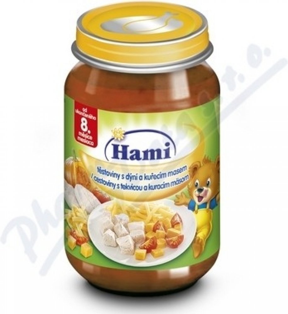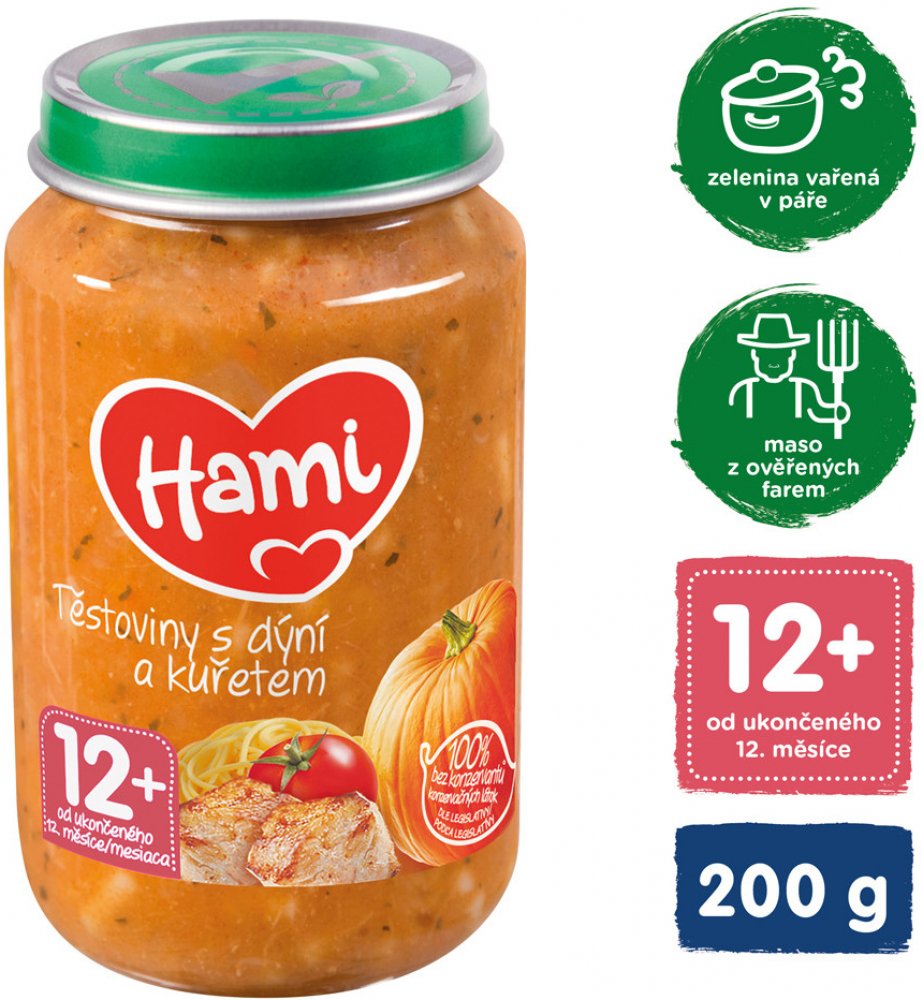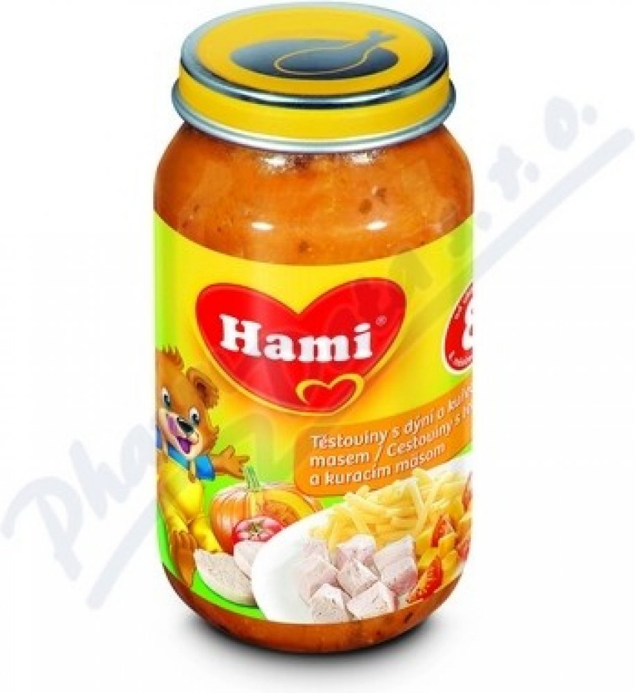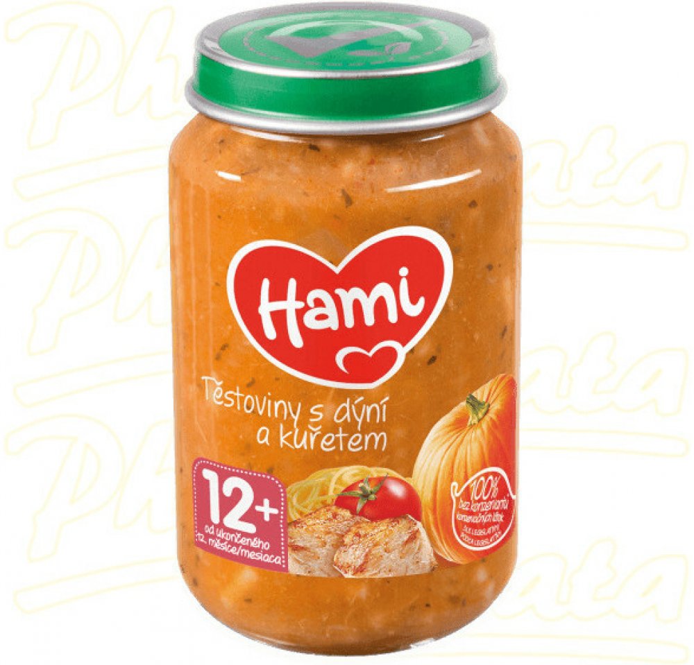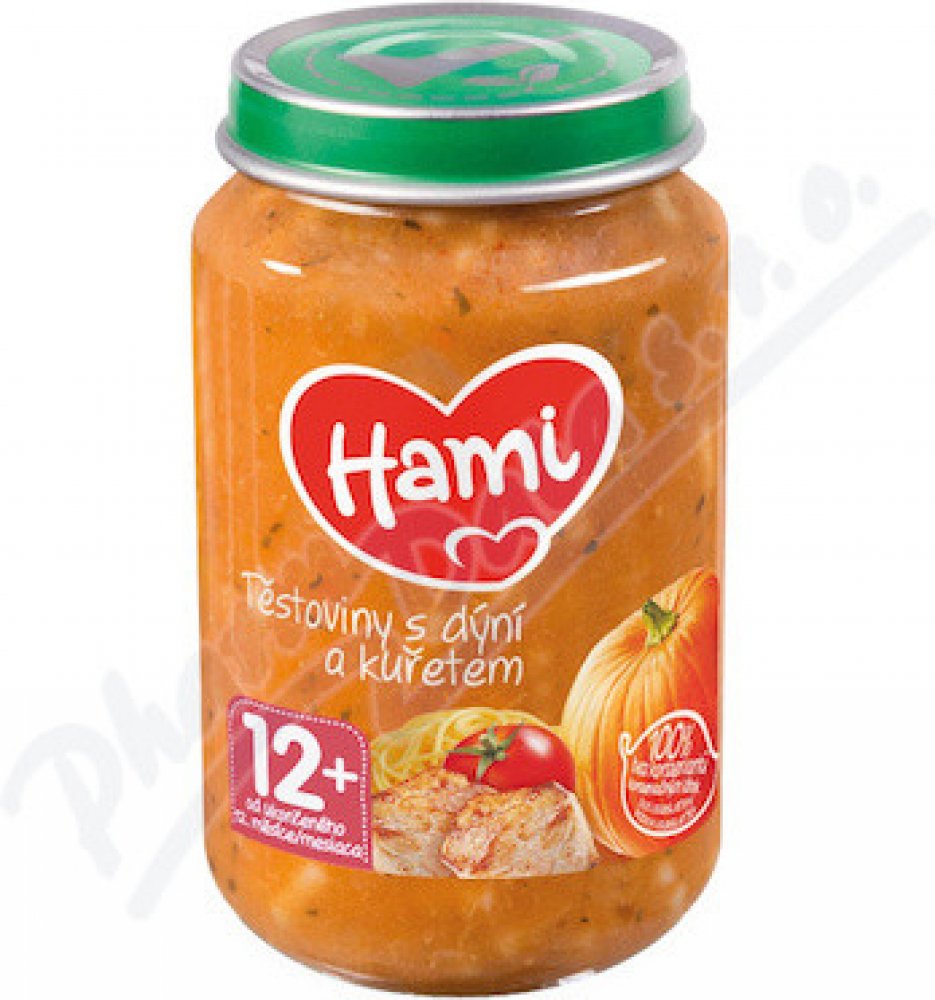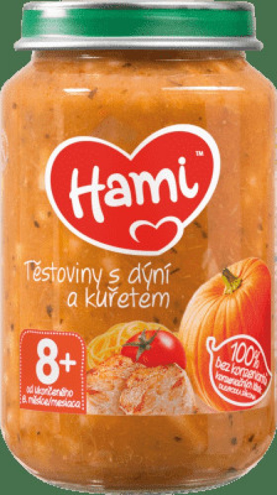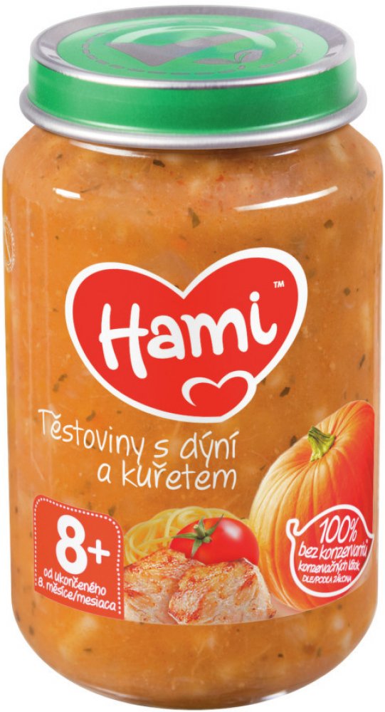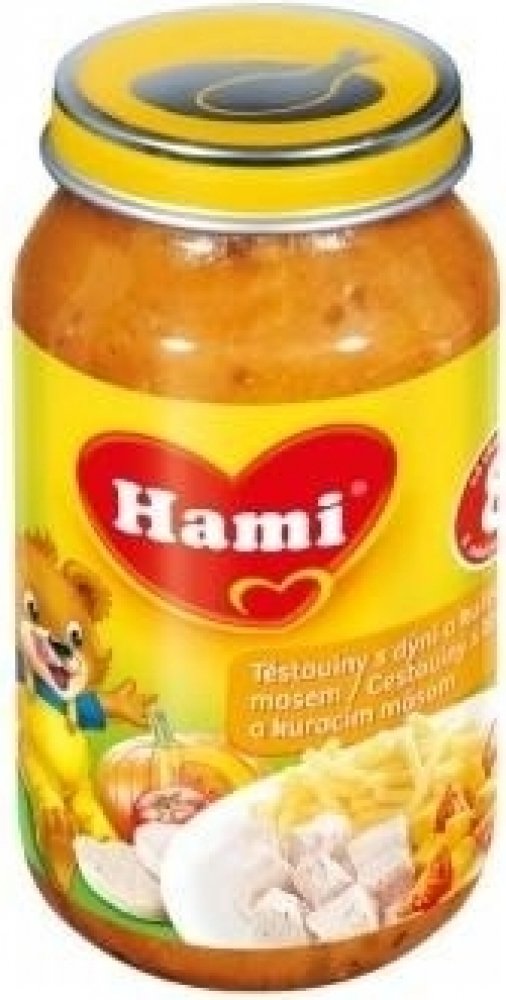 Hami příkrm těstoviny s dýní a kuřecím masem je pokrm pro děti a kojence od 8. měsíce. Představuje kompletní a vyvážené jídlo pro kojence i batolata, které je přizpůsobeno výživovým potřebám dítěte v tomto věku. Je bohatým zdrojem bílkovin a železa, které jsou potřebné pro správný růst a vývoj dítěte. Obsahuje malé kousky, které napomáhají rozvoji kousání a žvýkání. S 6 druhy zeleniny, bez konzerv...