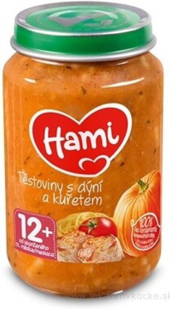 Hami příkrm těstoviny s dýní a kuřecím masem je pokrm pro děti a kojence od 8. měsíce. Představuje kompletní a vyvážené jídlo pro kojence i batolata, které je přizpůsobeno výživovým potřebám dítěte v tomto věku. Je bohatým zdrojem bílkovin a železa, které jsou potřebné pro správný růst a vývoj dítěte. Obsahuje malé kousky, které napomáhají rozvoji kousání a žvýkání. S 6 druhy zeleniny, bez konzerv...