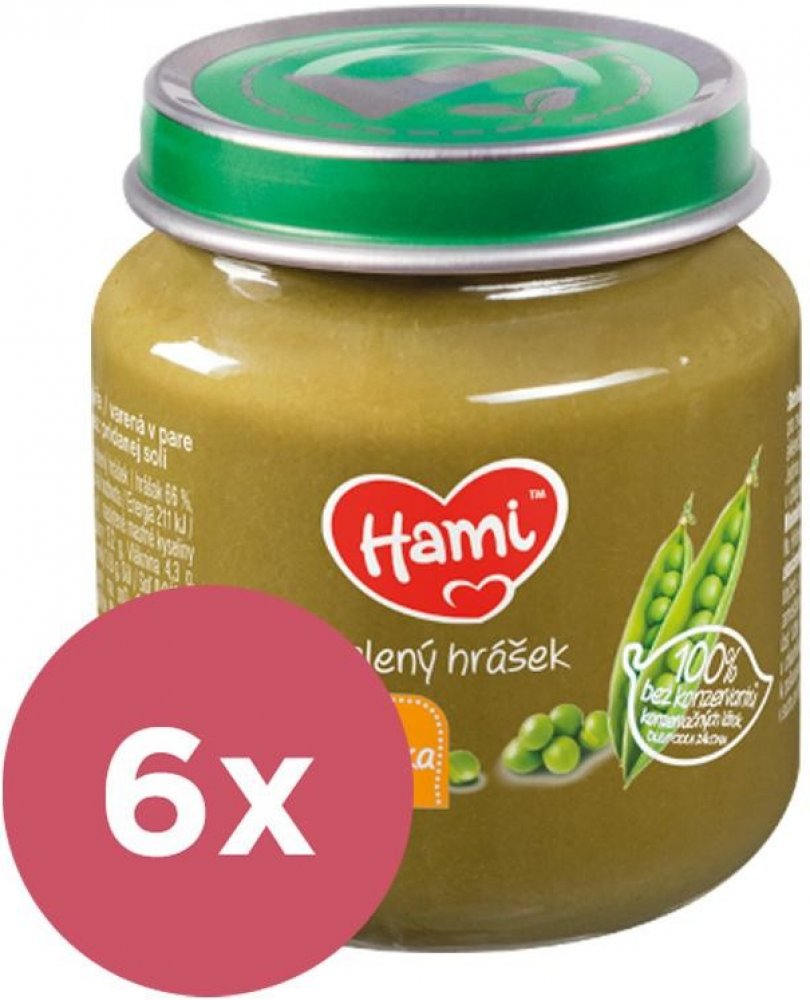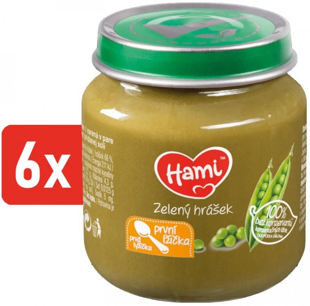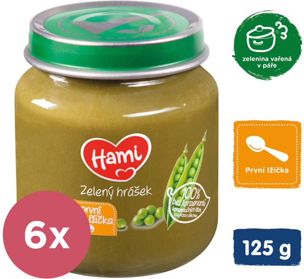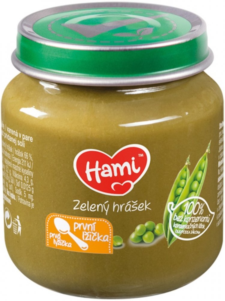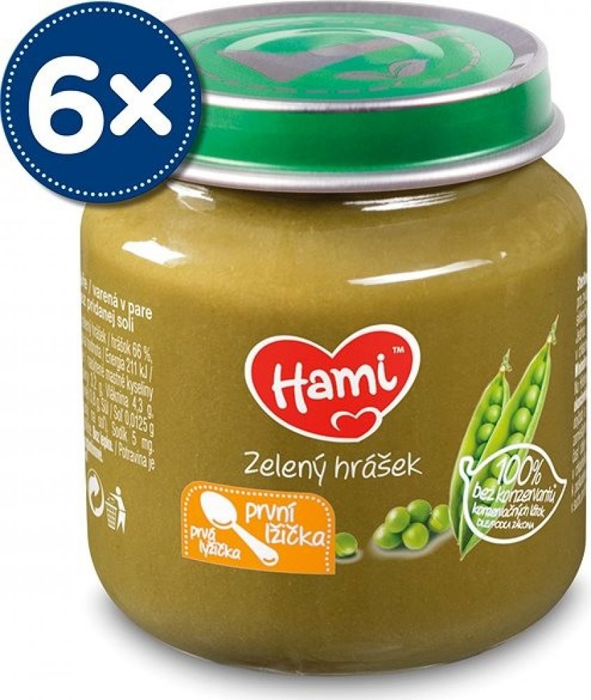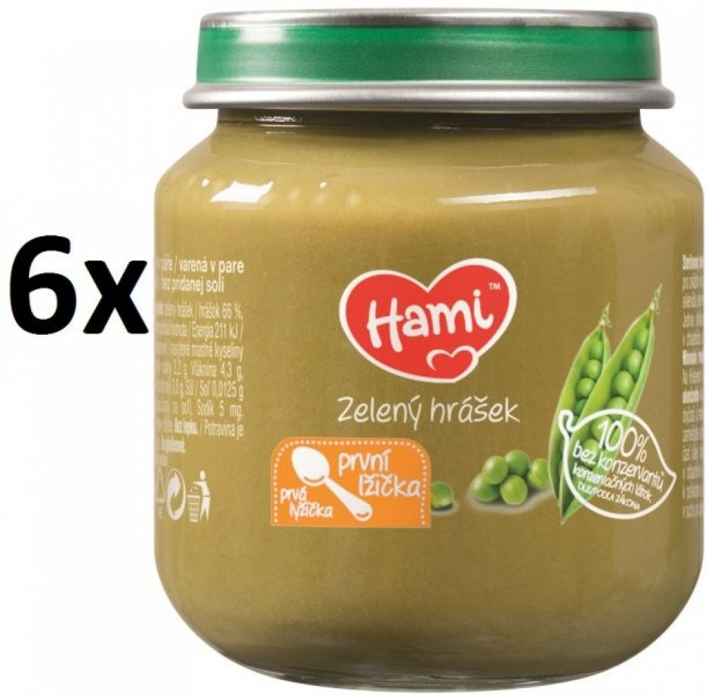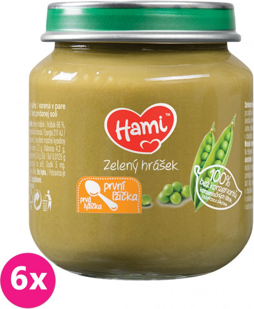 Vynikající zeleninový příkrm pro naše nejmenší je vhodné použít již od ukončeného 4. měsíce. Vlastnosti: od ukončeného 4. měsíce 100 % bez konzervantů dle zákona bez přidané soli zelenina vařená v páře bez lepku balení obsahuje 6 ks příkrmů Značka Hami získala v roce 2015 v nezávislé české anketě ocenění „Nejdůvěryhodnější značka dětské výživy“. Složení ve 100 g výrobku: zelený hrášek 66 %, voda Návod na použití: Při otevření musí víčko klapnout. Před ohřátím skleničku otevřete, promíchejte a ohřejte (nevařit) např. ve vodní lázni. Před podáváním zkontrolujte teplotu! Jednou ohřátou část již neuchovávejte. Nespotřebované množství uchovávejte v uzavřené skleničce v chladničce a spotřebujte do 48 hodin. Nepoužívejte kovovou lžičku, sklenička by se mohla poškodit. Skladujte v suchu při pokojové teplotě. Důležité upozornění: Potravina pro zvláštní výživu. Způsob použití a další informace na obalech a webových stránkách. Potravina je součástí smíšené stravy dítěte a není náhradou mateřského ani kojeneckého mléka. Kojení je nejlepší způsob výživy dítěte v prvních 6 měsících života. Zavedení doplňkové výživy konzultujte s pediatrem.