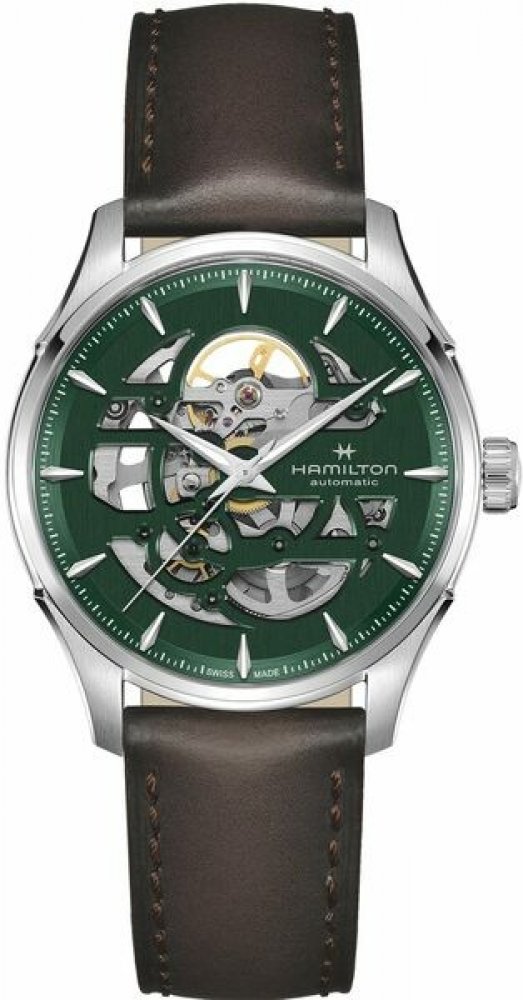Hamilton analogové kůže ocel 50 m automatické safírové elegantní pánské automatické bez osazení Jazzmaster kulaté hnědá zelená trnová spona 2 cm s trvalým svícením (tritium/Super-LumiNova) s občasnou údržbou (automatické) bez chytrých funkcí na ruku švýcarské bez číslic stříbrná ocel 4.0 cm střední 80 h 20.0 mm 11.05 mm 40.0 mm se superluminou