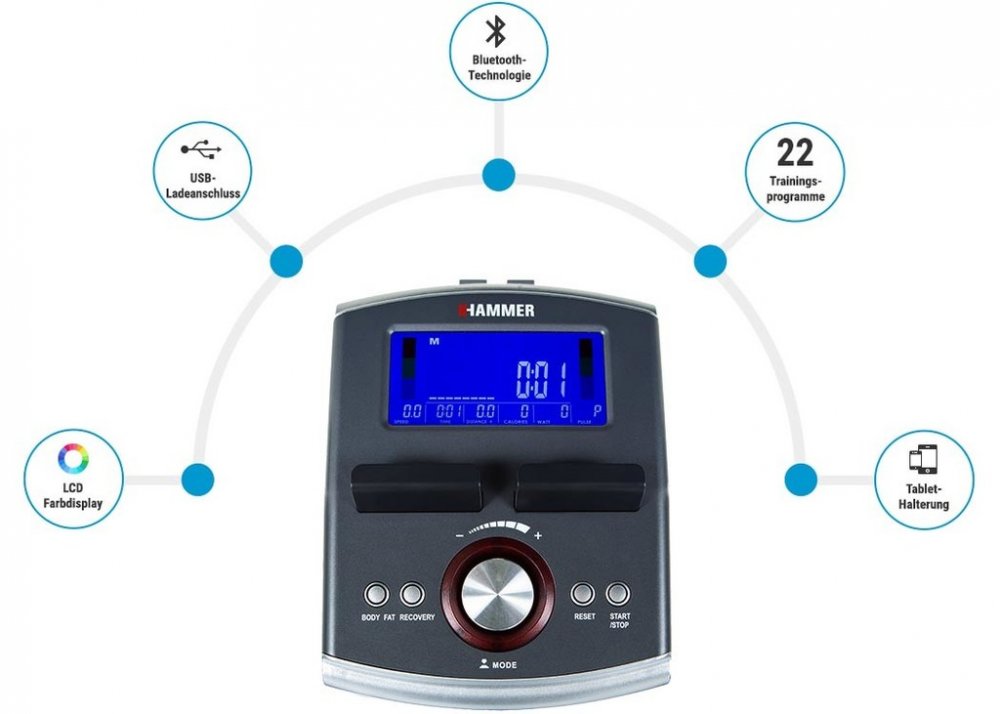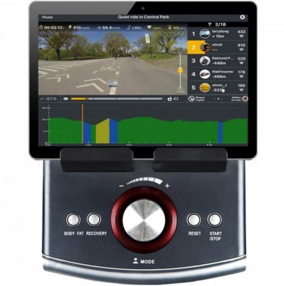 Trenažér disponuje přehledným 5,5" LCD displejem s přednastavenými programy zaměřenými na budování kondice či spalování tuků. Displej zobrazuje čas, vzdálenost, spálené kalorie, výkon, tepovou frekvenci atd.. Pomocí smartphonu nebo tabletu můžete ovládat trénink díky aplikacím jako Kinomap, iConsole nebo BitGym s připojením bluetooth.