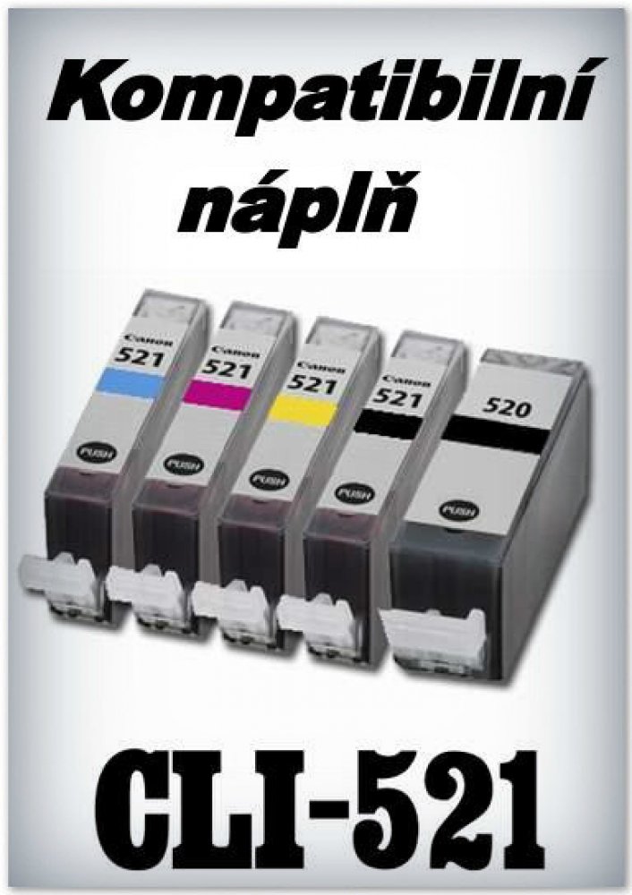 - Kompatibilní náplně Canon PGI-520 a CLI-521 - Náplně jsou prověřené a spolehlivě fungují - Náplně nezalepují tiskové hlavy K dispozici tyto náplně do tiskáren: PGI-520 - black (černá) 21 ml CLI-521Bk - photo black (foto černá) 11 ml CLI-521C - cyan (modrá) 11 ml CLI-521M - magenta (červená) 11 ml CLI-521Y - yellow (žlutá) 11 ml