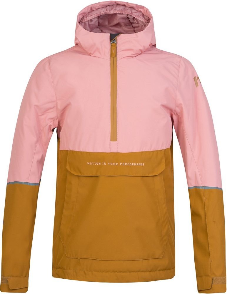 Dětská lyžařská bunda přes hlavu Hannah Jumy s membránou Resstex s vodním sloupcem i prodyšností v hodnotách 10 000. Pohodlný střih bundy typu anorak má prostornou přední kapsu s klopou na suchý zip a v ní dvě integrované 2 hlavní kapsy na zip. Bunda má sněhový límec v pase a anatomicky tvarované rukávy zakončené stahováním patkou na suchý zip.