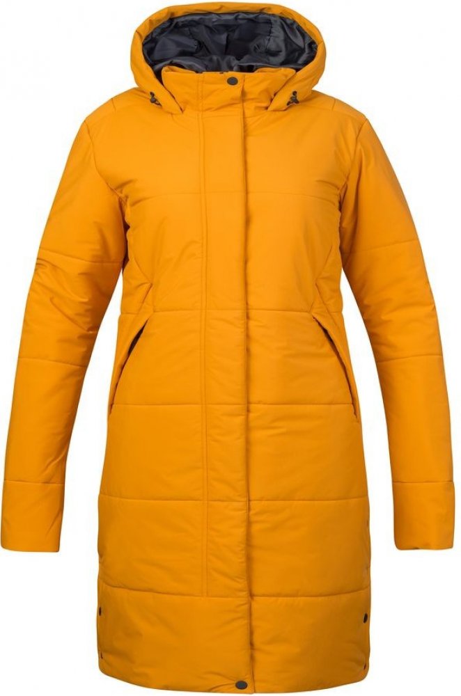 Kabát má zateplený límec s kapucí se stahováním, dvě zateplené hlavní kapsy na zip, jednu vnitřní kapsu na zip a hlavní zip krytý légou.