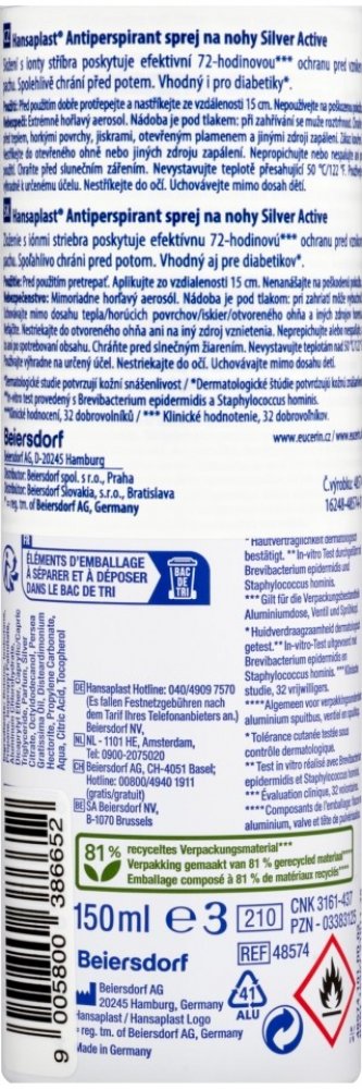 Zatímco běžné spreje jen překrývají zápach parfemací, Hansaplast Silver Active řeší problém u kořene – likviduje bakterie. Neobsahuje alkohol, je šetrný i k citlivé pokožce a nezanechává nepříjemný film ani lepkavý pocit. Vyrobeno v Německu – kvalita, na kterou se můžete spolehnout.