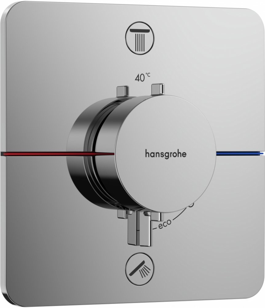 2 spotřebiče Termostatická kartuše, ventil Select Start/Stop pro ovládání spotřebičů Ovladač proudu vody s funkcí zastavení Pohodlné zapnutí/vypnutí velkým tlačítkem Select Materiál tlačítka: kov Materiál ovladače: kov Současné použití více spotřebičů Maximální průtok při 3 barech: 22,1 l/min Minimální provozní tlak: 1 bar Maximální provozní tlak: 10 barů Plochá kartuše pro více místa ve sprše Kar...