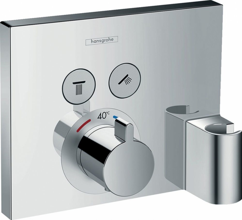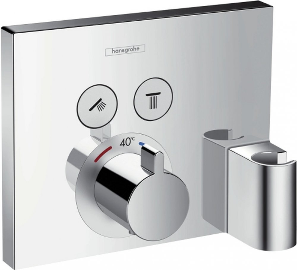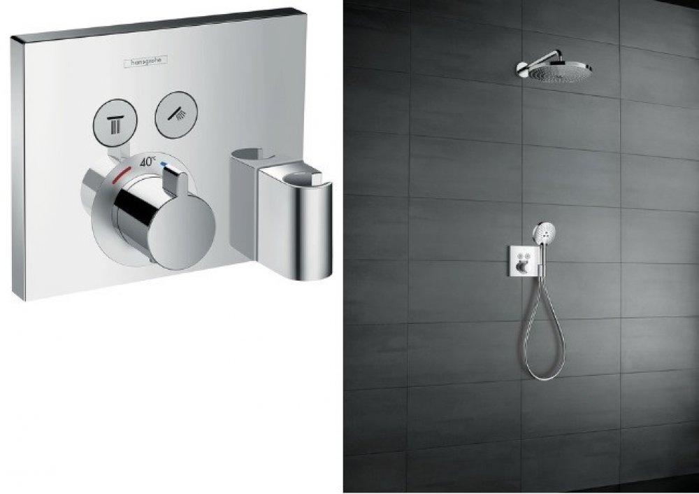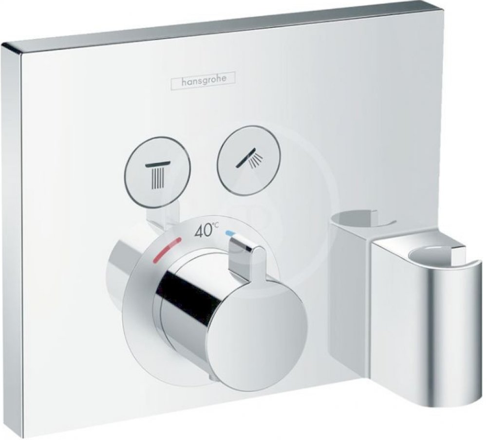 Podomítková termostatická baterie ve čtvercovém provedení ShowerSelect od společnosti Hansgrohe je prostorově úspornou alternativou klasických nástěnných baterií. Podomítková instalace znamená, že celá technická část je umístěna ve zdi a viditelná je pouze řídicí jednotka, čímž vzniká znatelně více prostoru a volnosti pohybu při koupání nebo sprchování. Moderní design baterie je navíc vizuálně přitažlivý. Její povrch je lesklý, trvanlivý a mimořádně odolný. Baterie má 2 tlačítka, která lze v případě potřeby používat současně. Průtok vody se mění pouhým stisknutím tlačítka. Díky tomu můžete přepínat mezi výtokem pro sprchu a vanu nebo ruční a horní sprchou podle toho, zda baterii používáte ve vaně nebo ve sprše. Pomocí otočného ovladače nastavíte požadovanou teplotu vody. Baterie navíc obsahuje i držák na ruční sprchu.