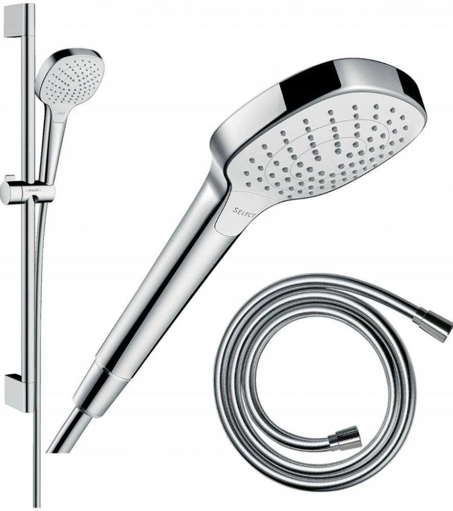 Technické parametry druh proudu: Rain, Turbo Rain, IntenseRain pohodlné přepínání druhů proudu tlačítkem Select otočný kloub zabraňuje nepříjemnému kroucení sprchové hadice jezdec s možností nastavení úhlu sklonu o 45° maximální průtok (při 0,3 MPa): 9 l/min chromované držáky na stěnu z umělé hmoty Set obsahuje ruční sprchu Croma Select E Vario (# 26813400) sprchovou hadici Isiflex 1,60 m (# 28276000) nástěnnou tyč Unica’Croma 0,65 m (# 26503000)