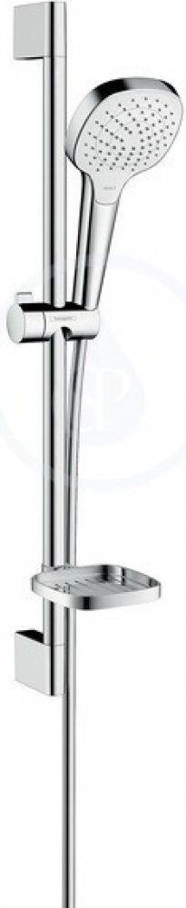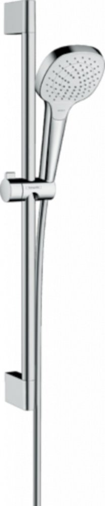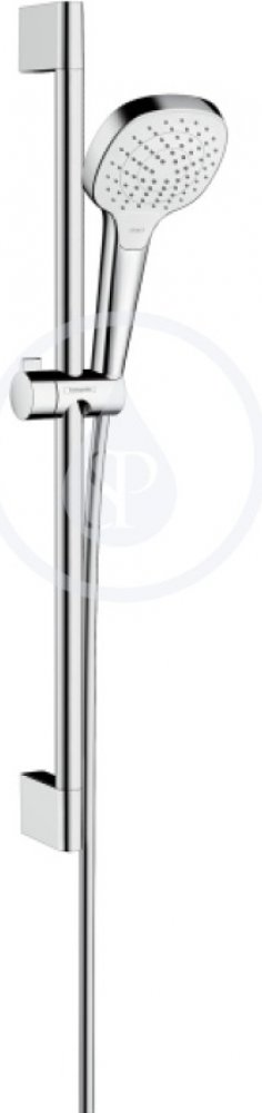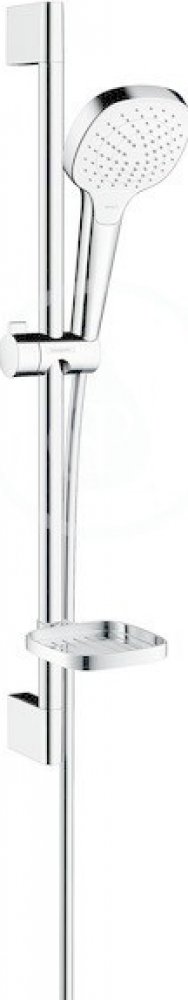 Technické parametry druh proudu: Rain, Turbo Rain, IntenseRain pohodlné přepínání druhů proudu tlačítkem Select otočný kloub zabraňuje nepříjemnému kroucení sprchové hadice jezdec s možností nastavení úhlu sklonu o 45° maximální průtok (při 0,3 MPa): 9 l/min chromované držáky na stěnu z umělé hmoty Set obsahuje ruční sprchu Croma Select E Vario (# 26813400) sprchovou hadici Isiflex 1,60 m (# 28276...