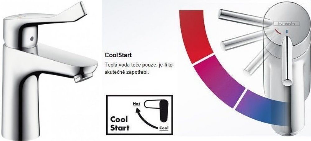 Tato technologie je šetrná vůči životnímu prostředí i vůči Vaší peněžence. Při středním nastavení rukojeti protéká výhradně studená voda, zatímco u standardních baterií se ve středním nastavení okamžitě spouští průtokový ohřívač nebo cirkulační čerpadlo. U baterií CoolStart se potrubní systém nemusí nutně naplnit teplou vodou. Posunutím páky vlevo dojde ke smíchání s horkou vodou. O výšce teploty rozhodujete vy. Posun páky doprava je zablokován (s pákou pro teplou vodu lze pohybovat jen doleva). Tím se výrazně snižuje spotřeba energie a tím i emise CO2.