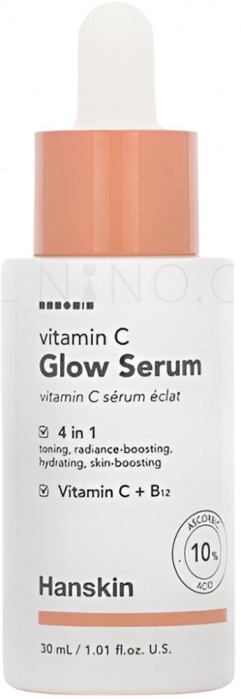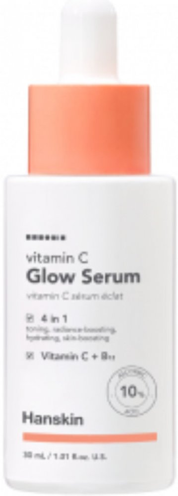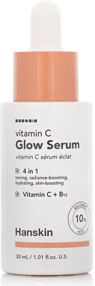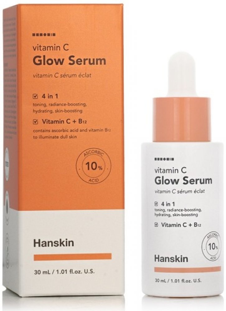 Hanskin - Vitamin C Glow Serum - pleťové sérum doporučené zejména pro citlivou, mdlou pleť a pleť, která potřebuje rozjasnit. Obsahuje 10 % vitamínu C ve formě kyseliny askorbové, která má na pleť rozjasňující a zesvětlující účinek a dodává jí zářivý a rovnoměrný tón bez pigmentových skvrn. Navíc pomáhá chránit před volnými radikály tím, že zpomaluje proces fotostárnutí. Působení proti volným radikálům je posíleno vitamínem E, vitamínem B12 a výtažkem z kořene kurkumy, které rovněž urychlují proces regenerace a zklidňují zarudnutí a podráždění.