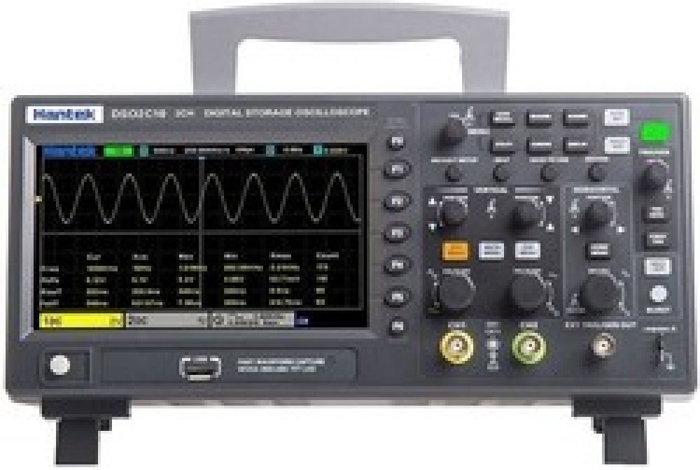 Osciloskop 2x100MHz HANTEK DSO2C10 **Specifikace:** Řada výrobce: DSO2000 Typ osciloskopu: číslicový Druh osciloskopu: DSO Napájení: 200-240VACPočet kanálů: 2 Pásmo: 100MHz Vzorkování: 1Gsps Délka paměti záznamu: 4Mpts/ch Druh použitého zobrazovače: barevný, TFT 7” Režimy spouštění: automatické, jednorázové, normální Spouštění: CAN/LIN, IIC, intervalem, nástupná hrana, okénkem, overtime, pattern, ...