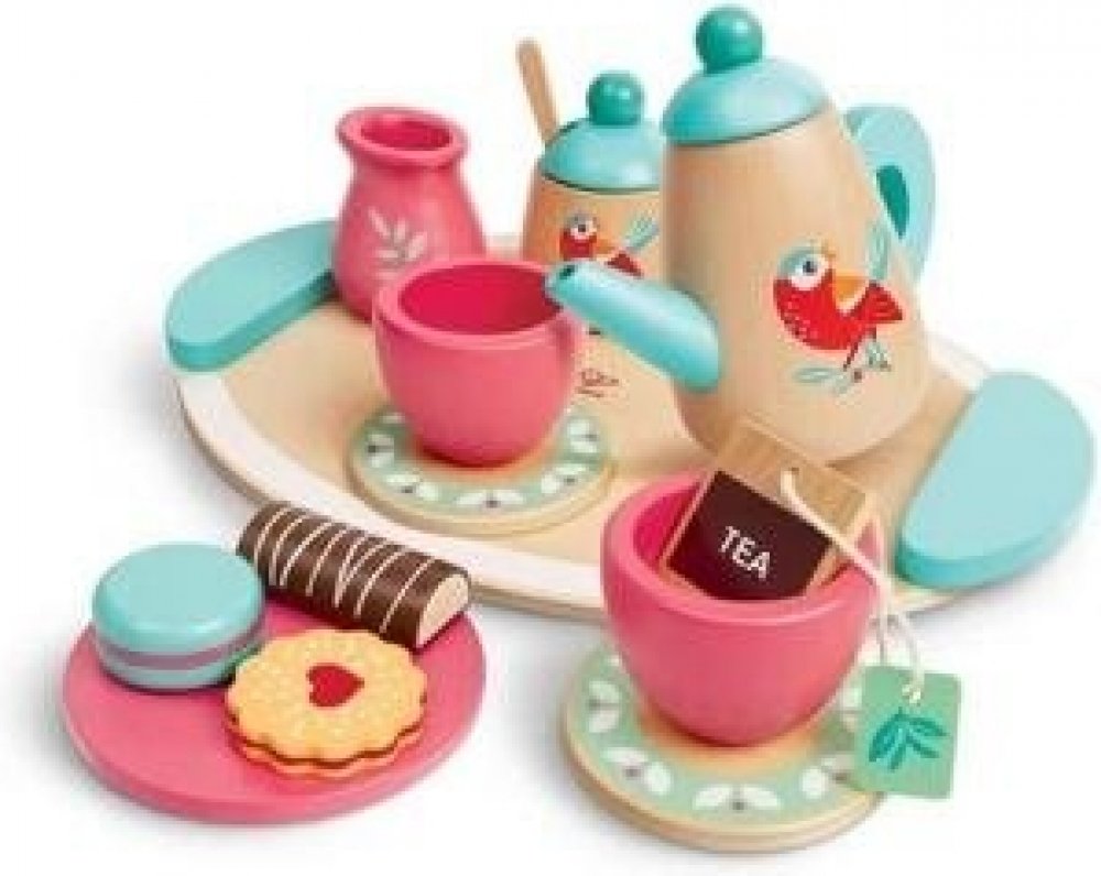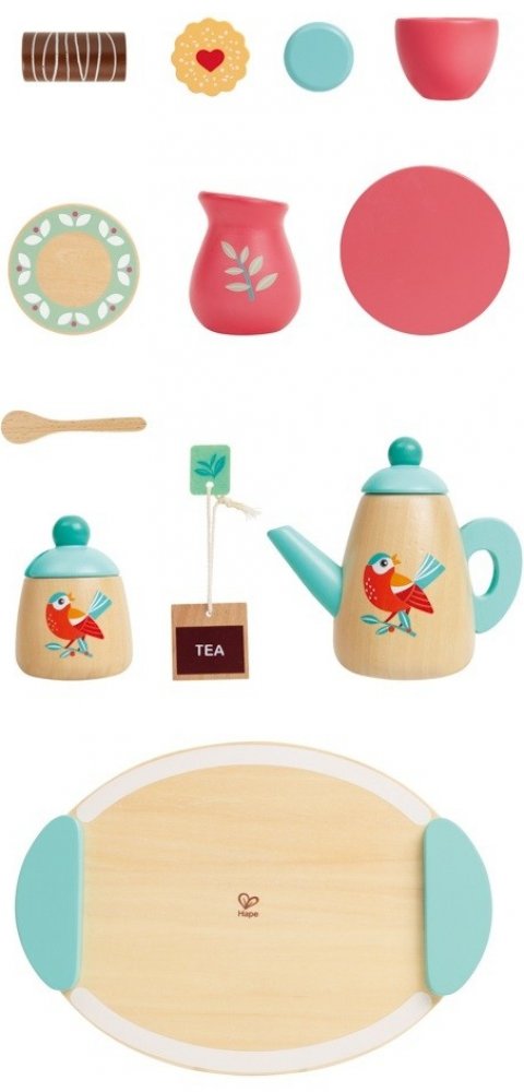 S touto kouzelnou čajovou sadou si nejmenší mohou užít veselé odpoledne s čajem a pamlsky s rodinou nebo přáteli. Čajový servis je dřevěný a obsahuje podnos, konvičku s poklicí, dva šálky s podšálkem, cukřenku, konvičku na mléko, sáček a tři dezerty na talíři. Čajový servis je pestrý a přátelský k dětem a ty nejmenší okouzlí krásným ptačím motivem. Balení: 8,2x24,3x30,3cm. Věk: 2+