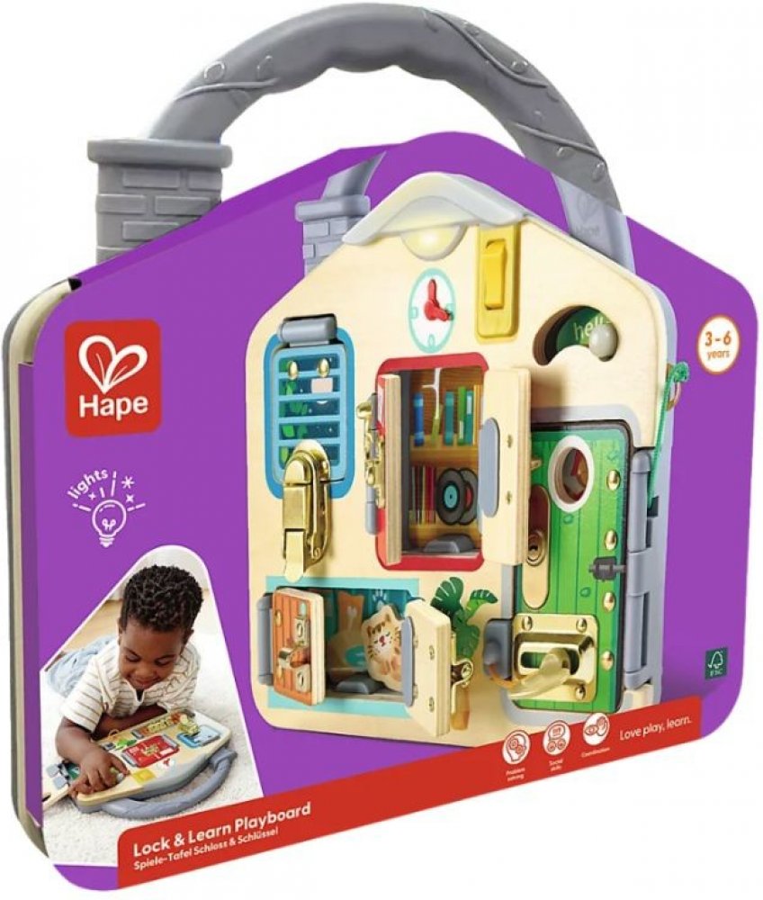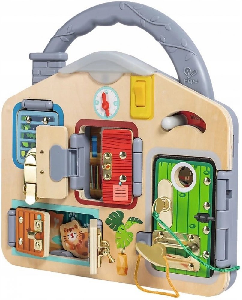 Začněte své odemykací dobrodružství s podmanivou hrací deskou od Hape. Obsahuje různé zámky, dveře a tajné chodby pro nápaditou hru a zábavu při řešení problémů. Hračka je dodávána s různými západkami, které lze otevřít a zamknout. Obsahuje také funkční hodiny, světlo a kočku, kterou lze schovat za jakékoli dveře. Deska zámku je dodávána s rukojetí, která usnadňuje přenášení. Pomáhá dětem rozvíjet jemné motorické dovednosti. Rozměr balení: 29,5x6x29 cm. Věk 3+