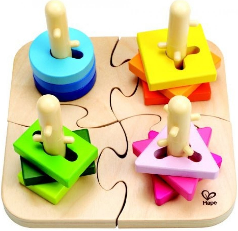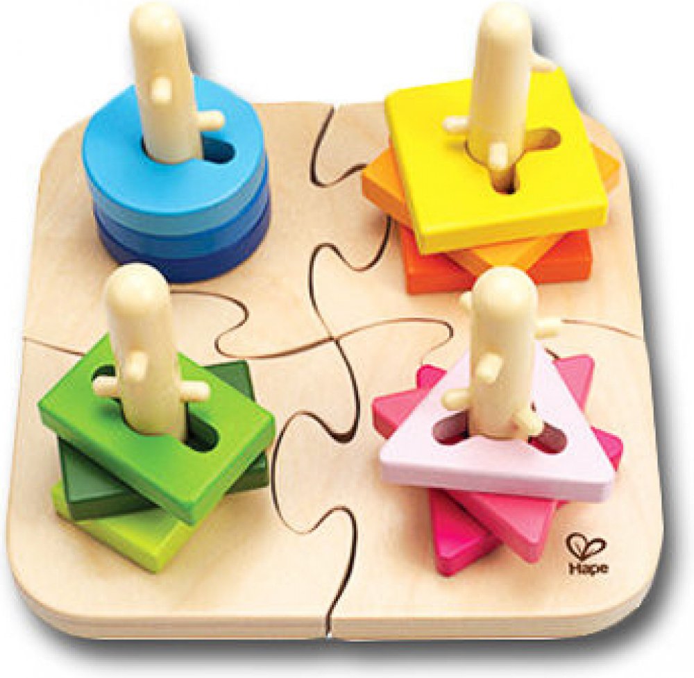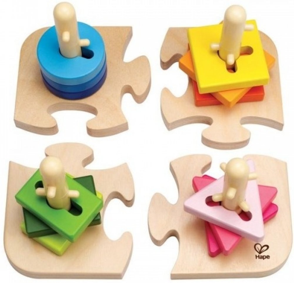 Kreativní puzzle pro nejmenší! Zaujmou kvalitním provedením a výraznými barvami. Jedná se o čtyři dílky puzzle, které jsou spojené dohromady, a na každém je umístěn dřevěný sloupek. Jednotlivé tvary i