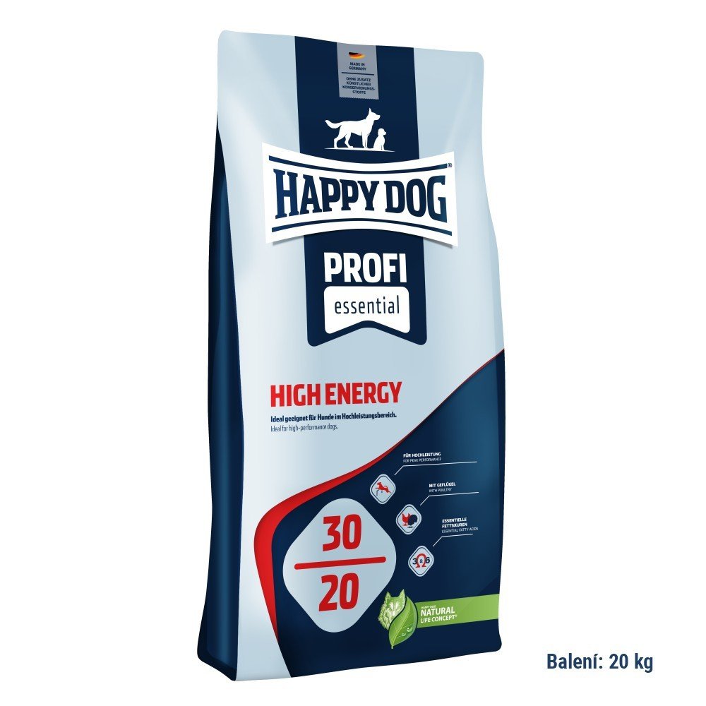 Prémiové krmivo Happy Dog Profi-Line High Energy s hovězím masem je určeno speciálně pro dospělé psy s extra vysokou zátěží a potřebou zvýšených živin. Ideální krmivo pro psy věnující se vytrvalostnímu mushingu, caniscrossu, dog trekkingu, pullingu a jiným sportovním nebo pracovním aktivitám se zvýšenou tělesnou zátěží. Krmivo pro psy High Energy obsahuje vysokou koncentraci živin pro velmi aktivní psy. Krmivo Happy Dog HIGH ENERGY (protein 30%, tuk 20%) je vhodné i pro březí a kojící feny. Recepturu 30/20 je možné nasadit i jako tzv. antistresové krmivo pro psy při dlouhých transportech. Obsahuje totiž všechny potřebné minerální, stopové a vitamínové látky v takovém množství, aby vyhovovalo i psům při vysoké zátěži.